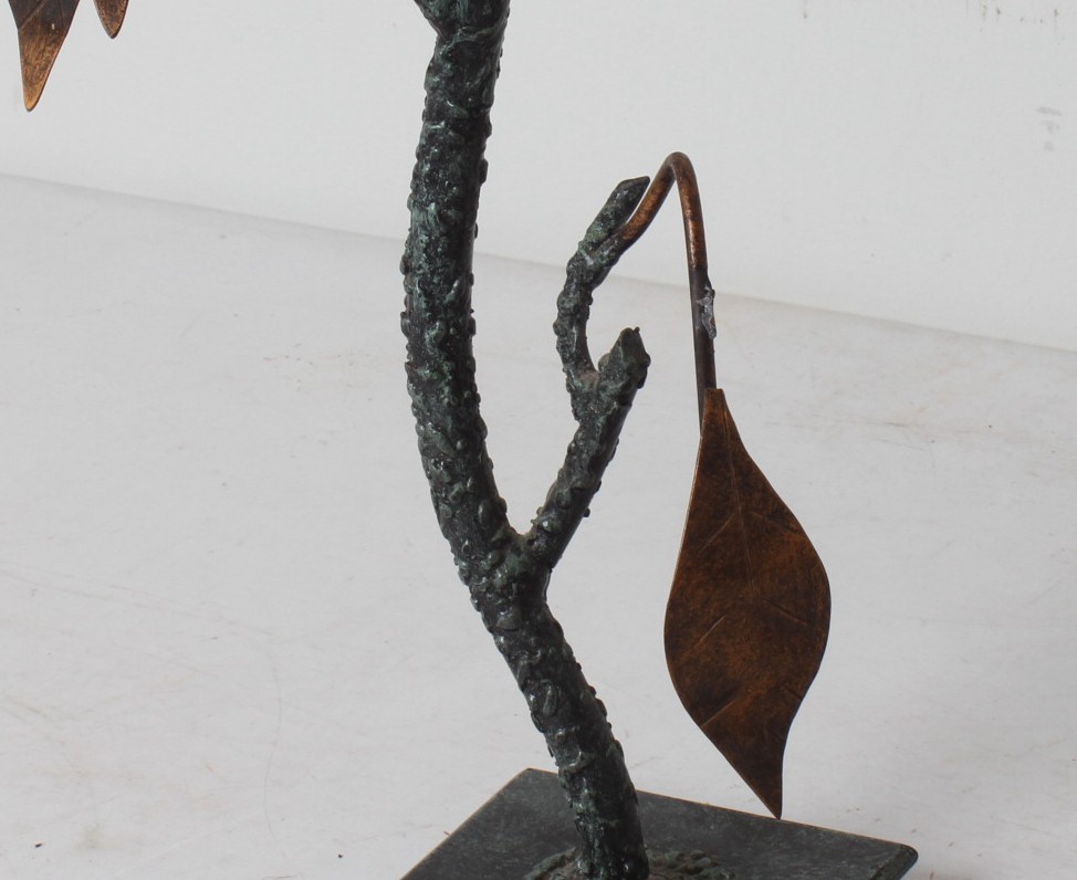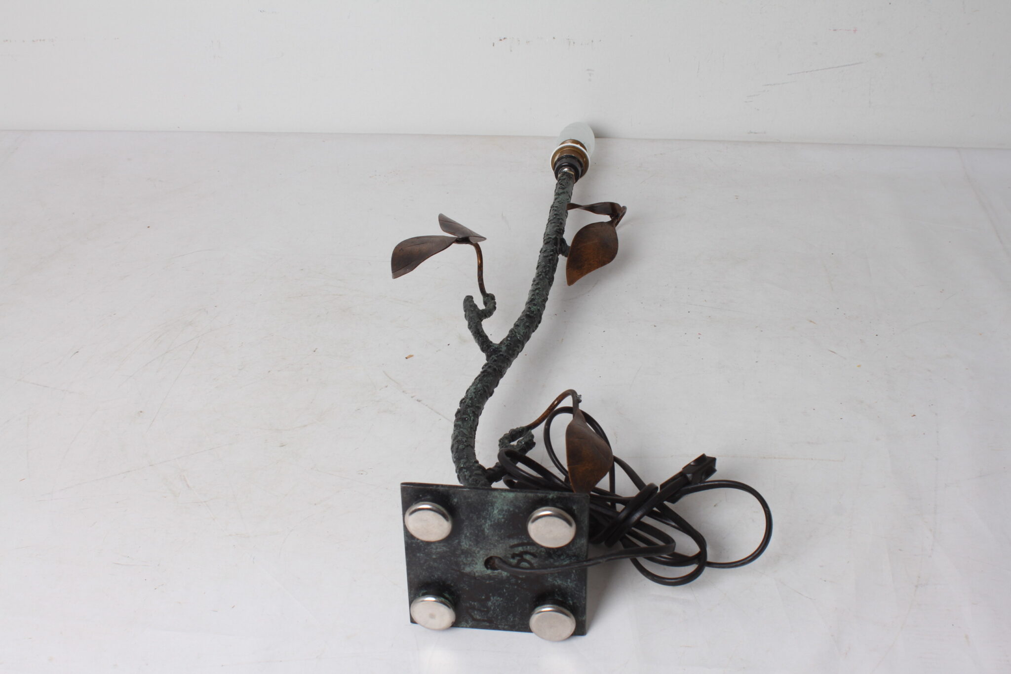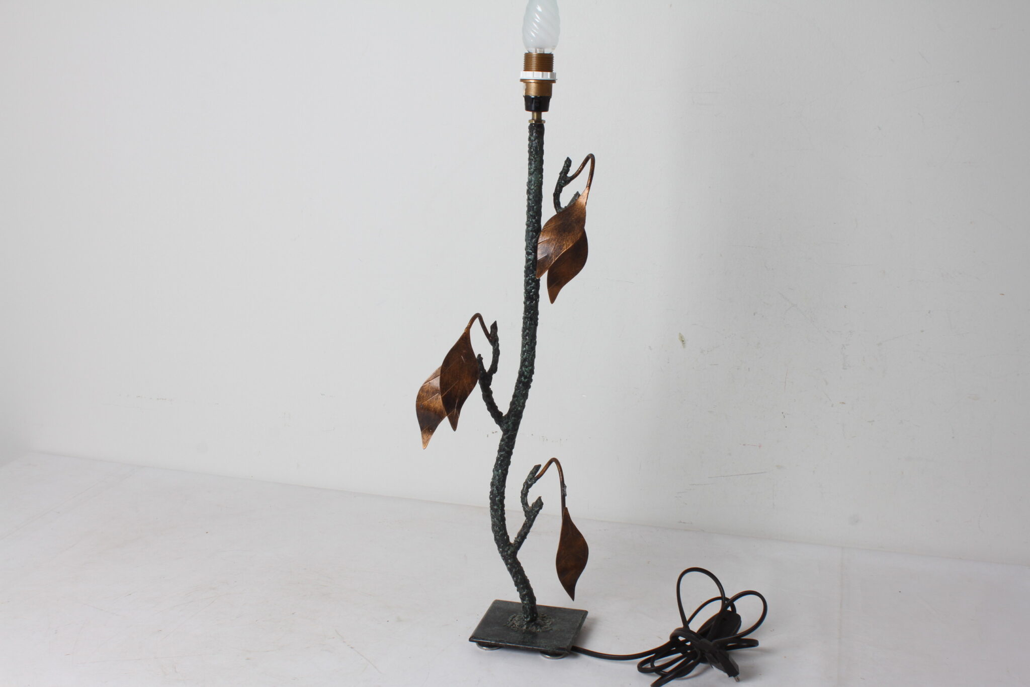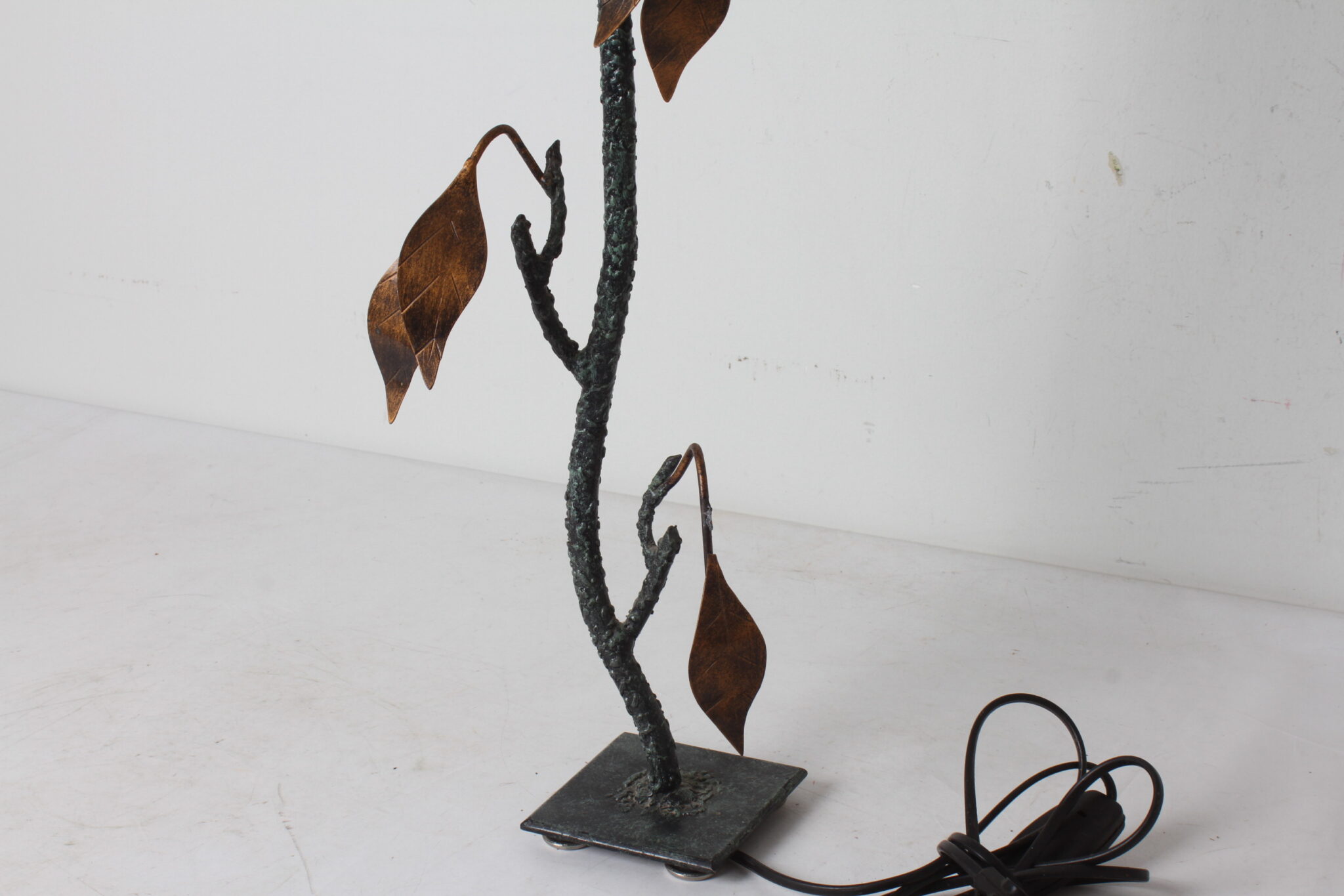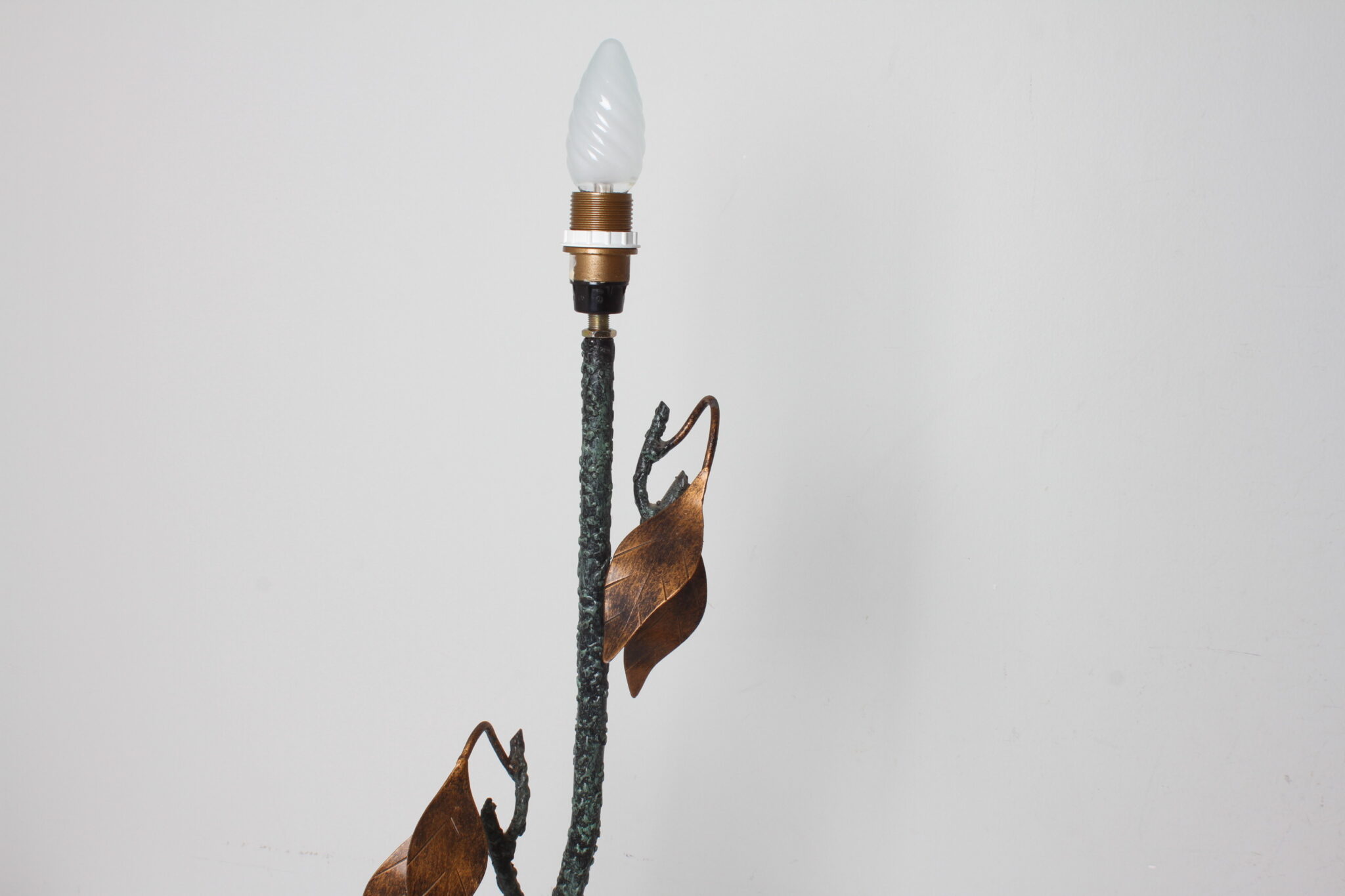Pied de lampe brutaliste en fer forgé vert et feuilles dorées.