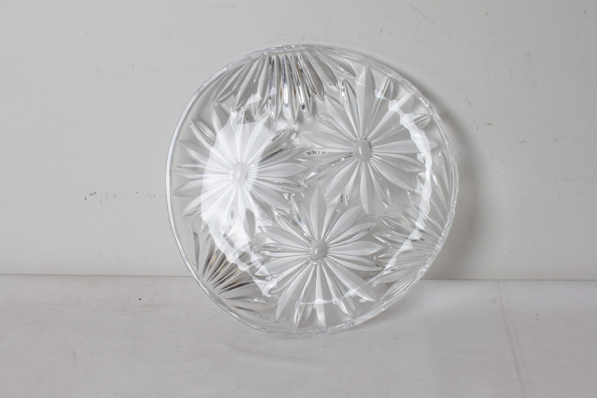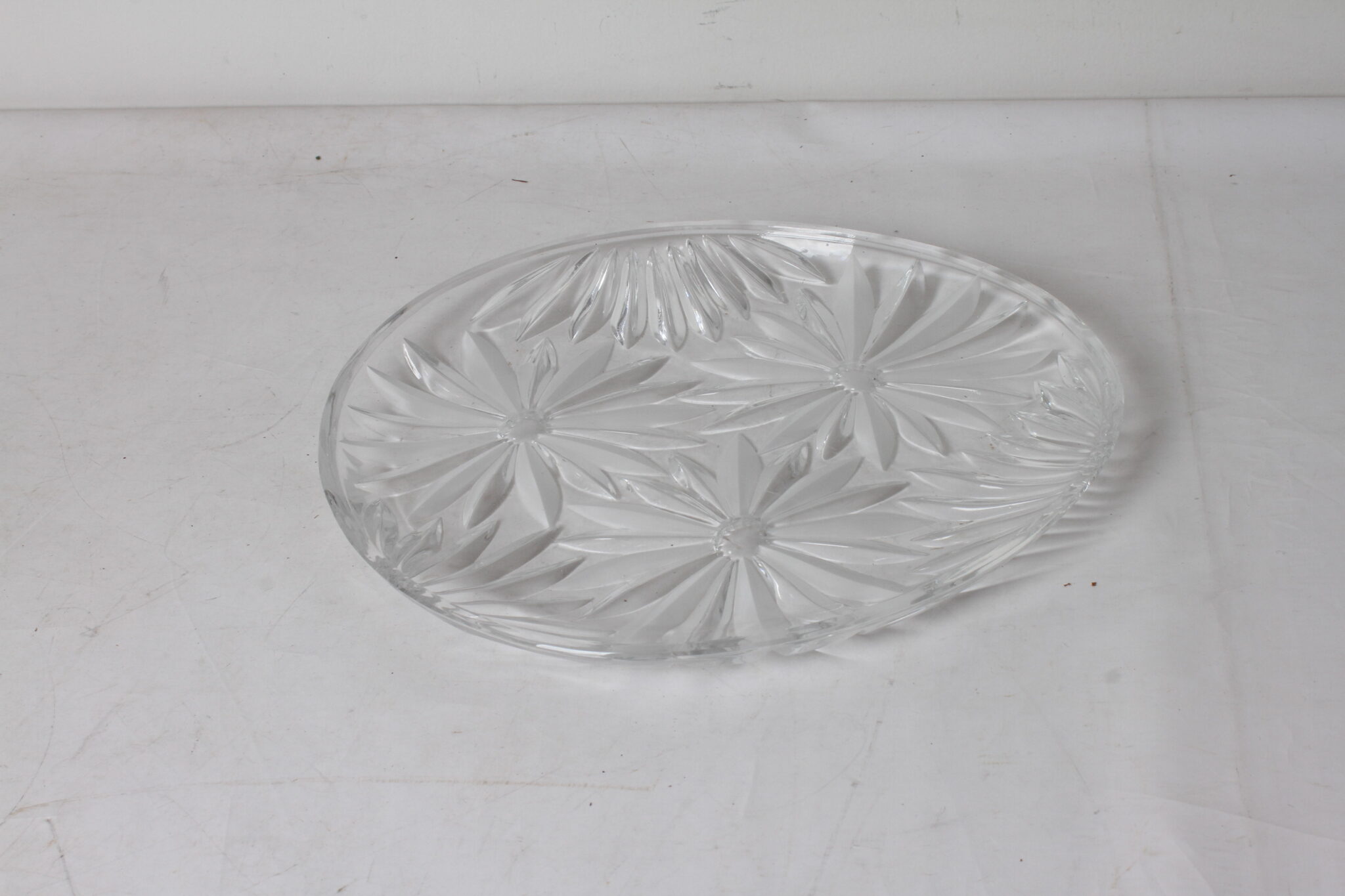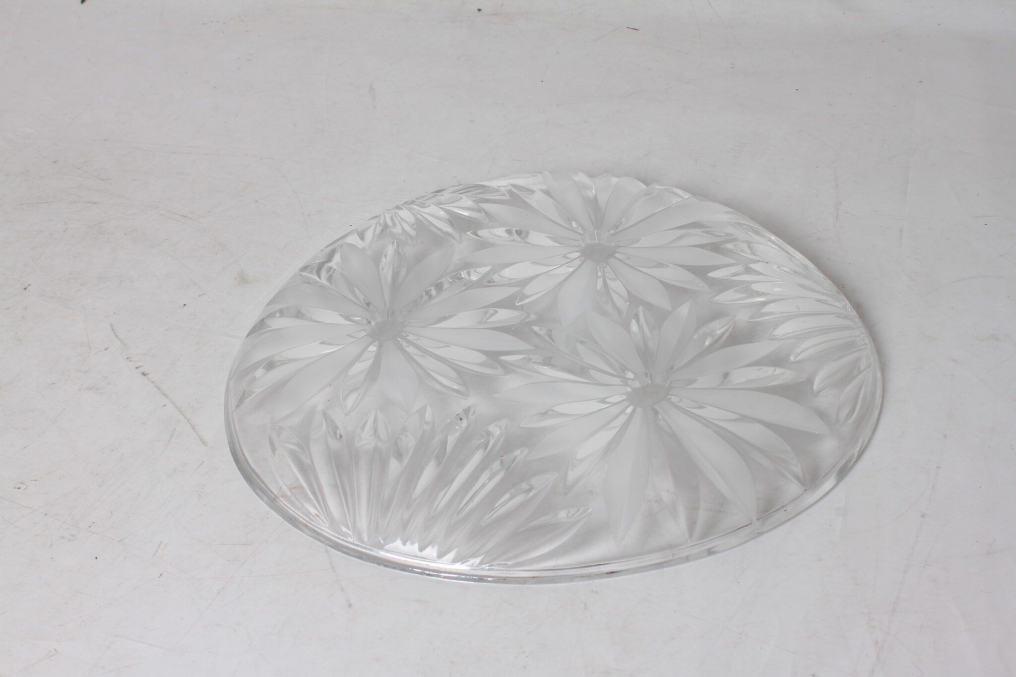 Plat de présentation triangulaire en verre à décor de fleurs taillées.