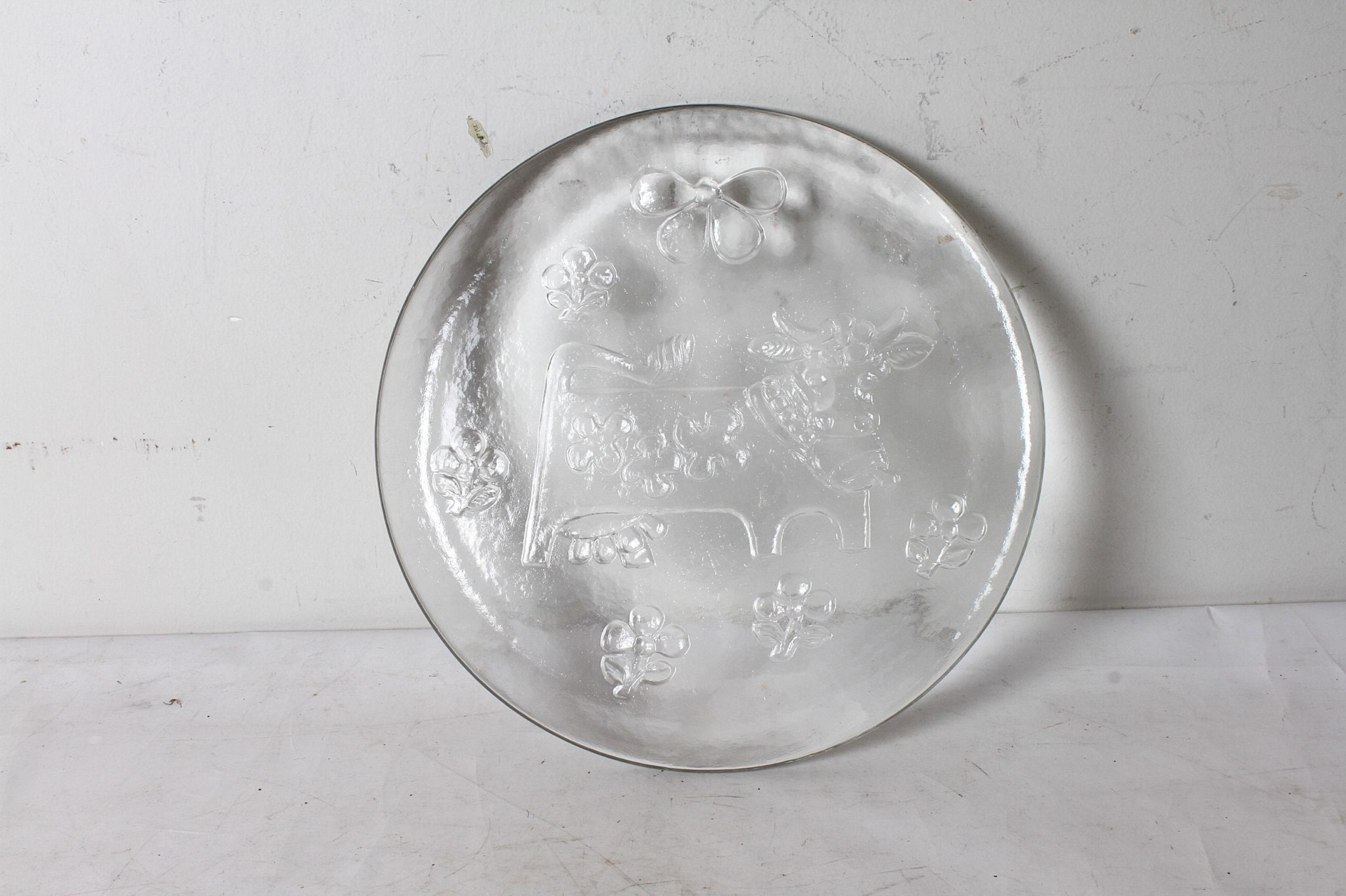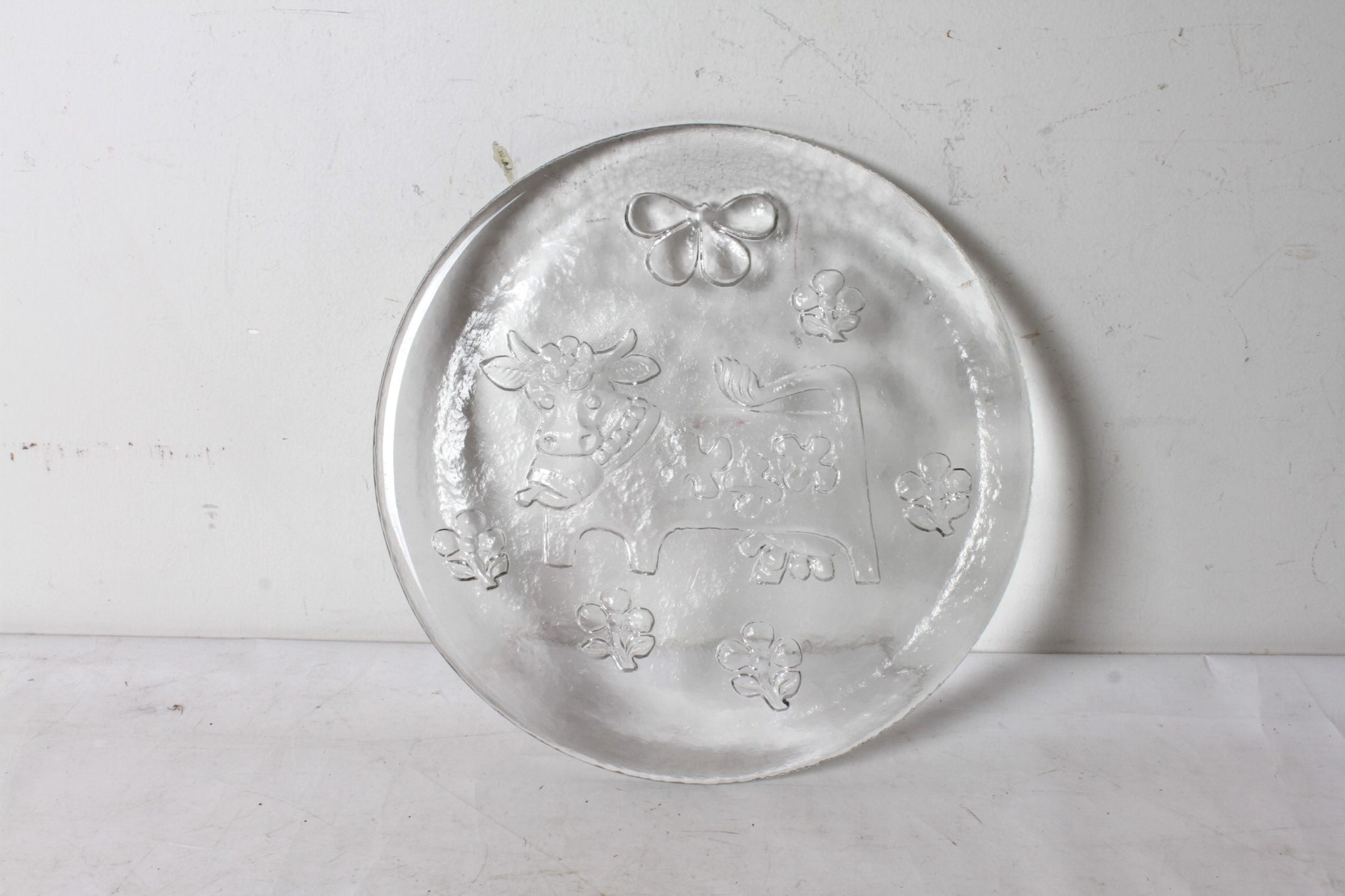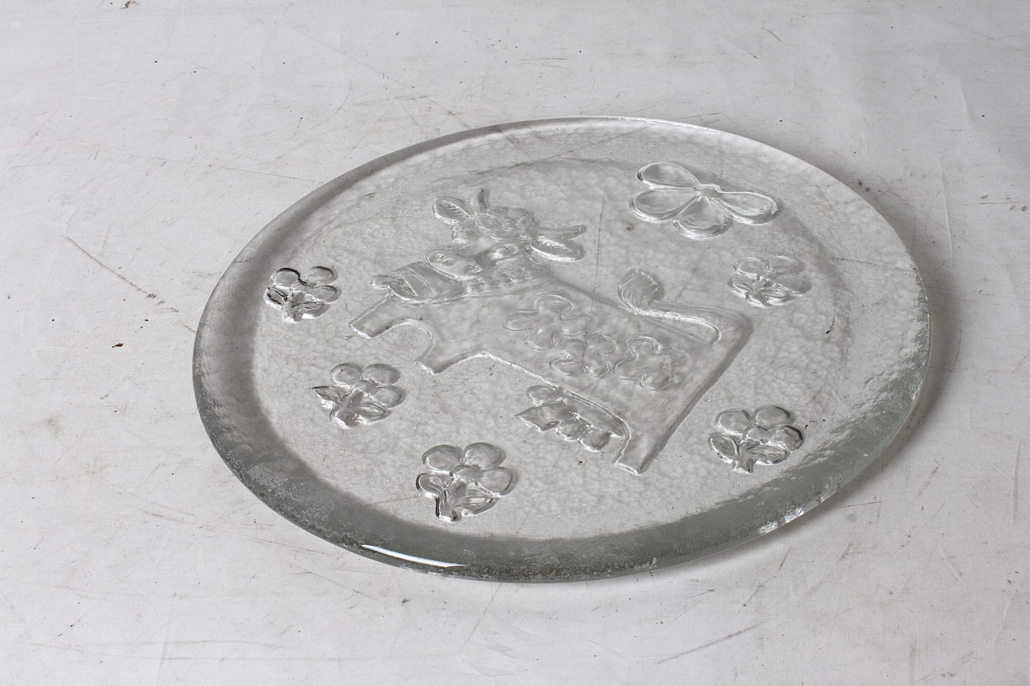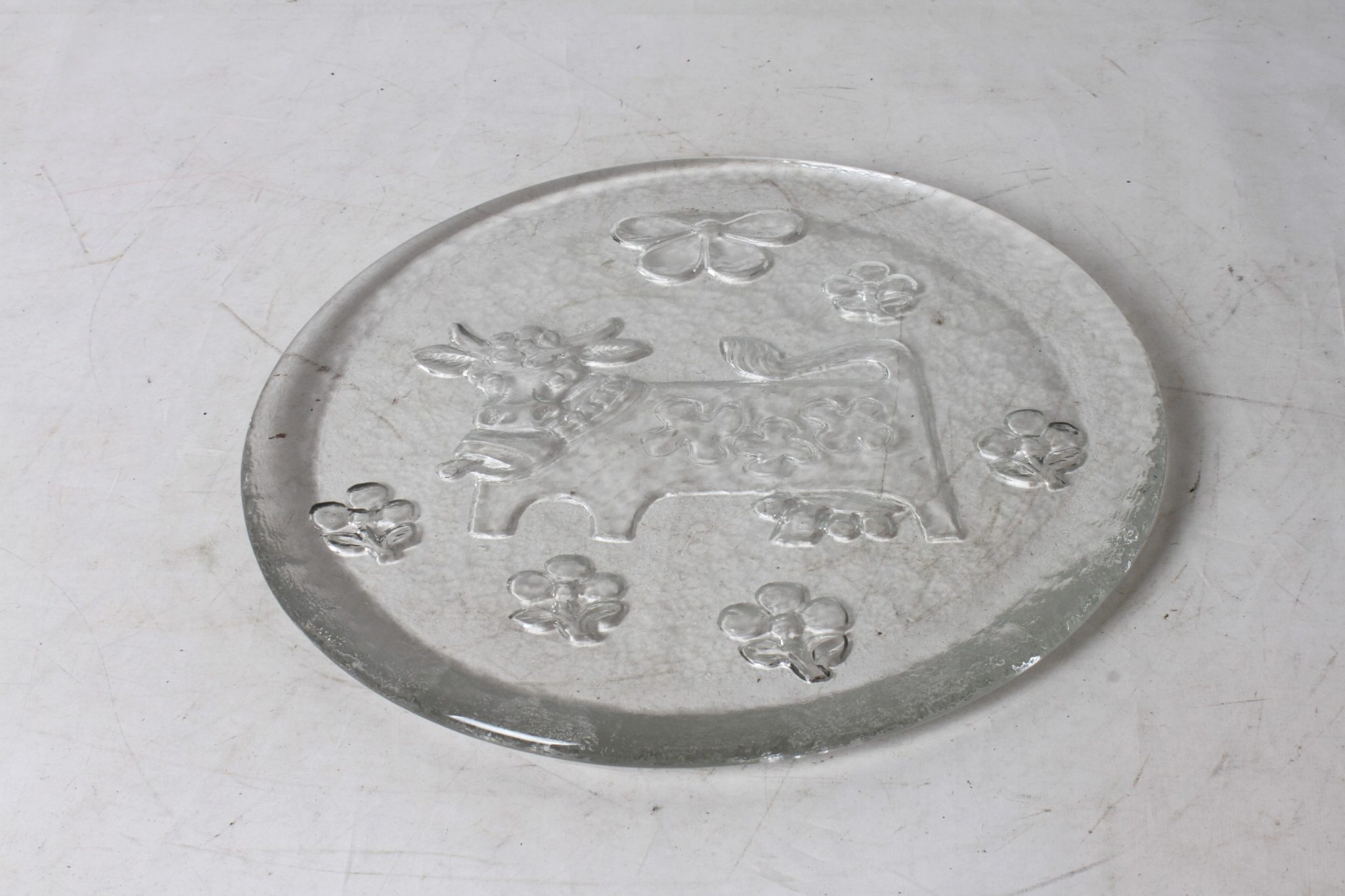 Plateau à fromage en verre épais, motifs champètres en relief.