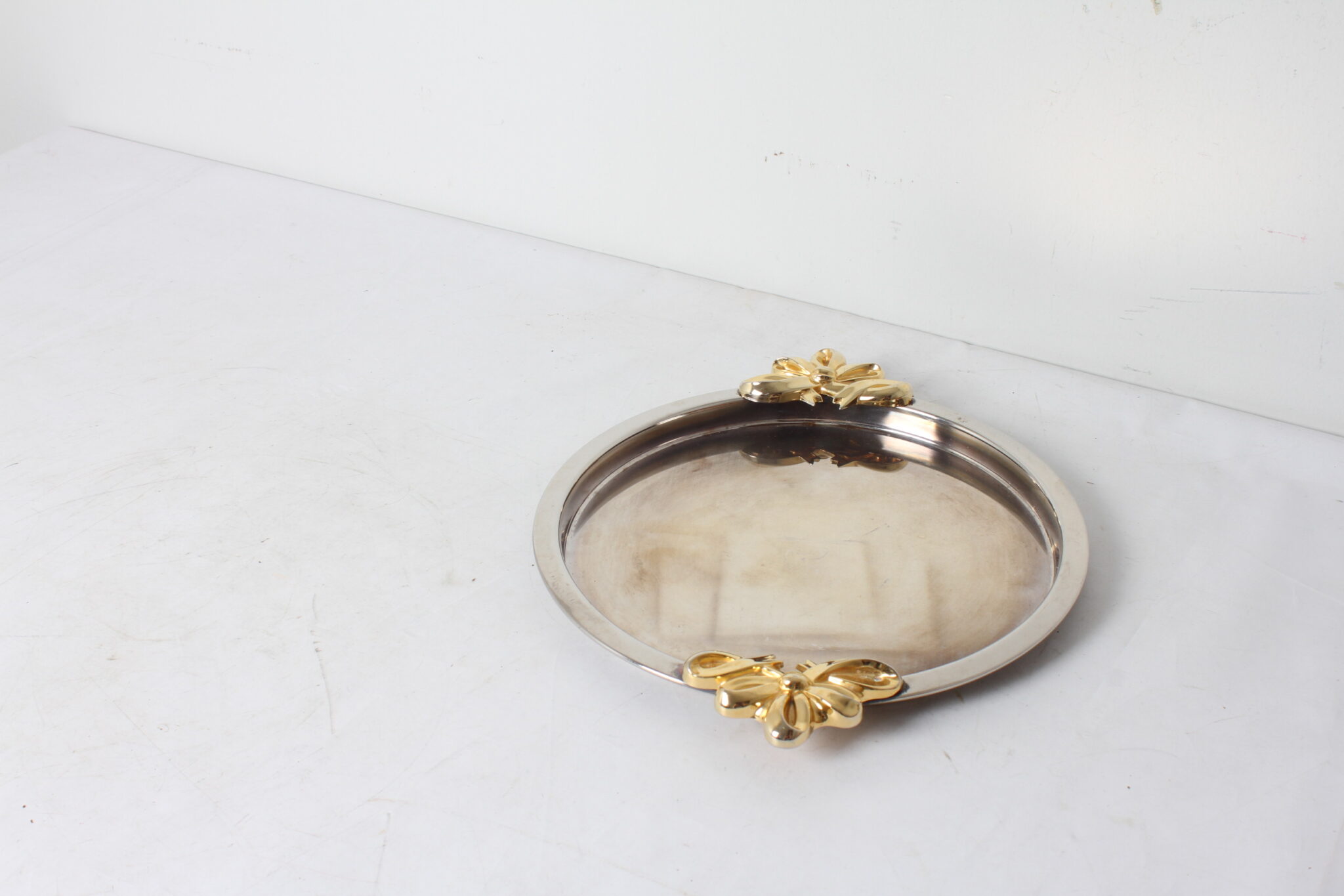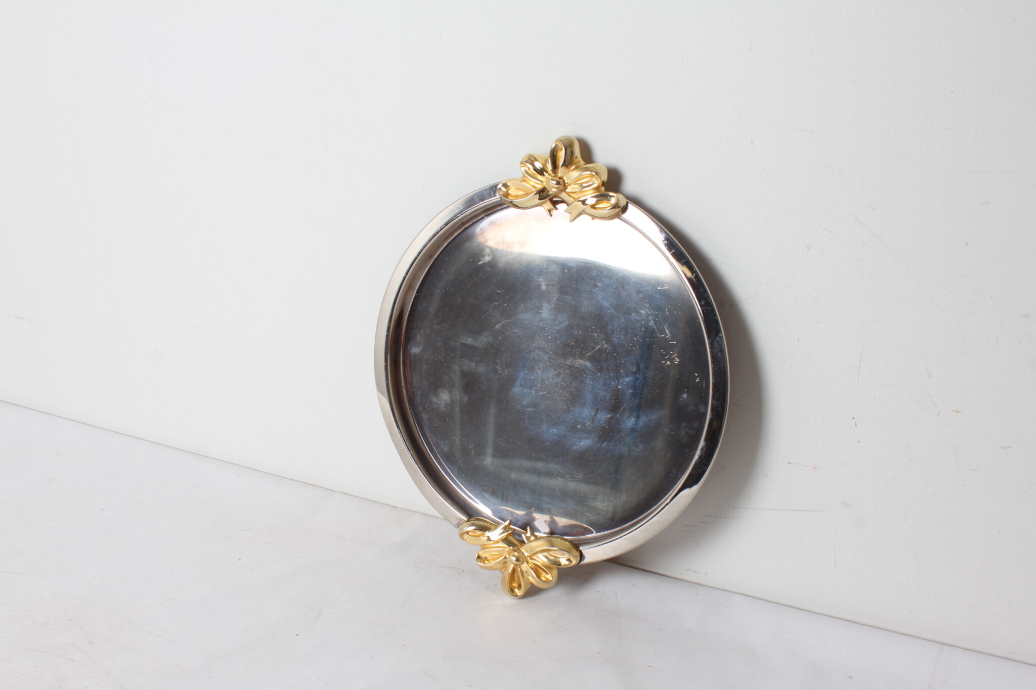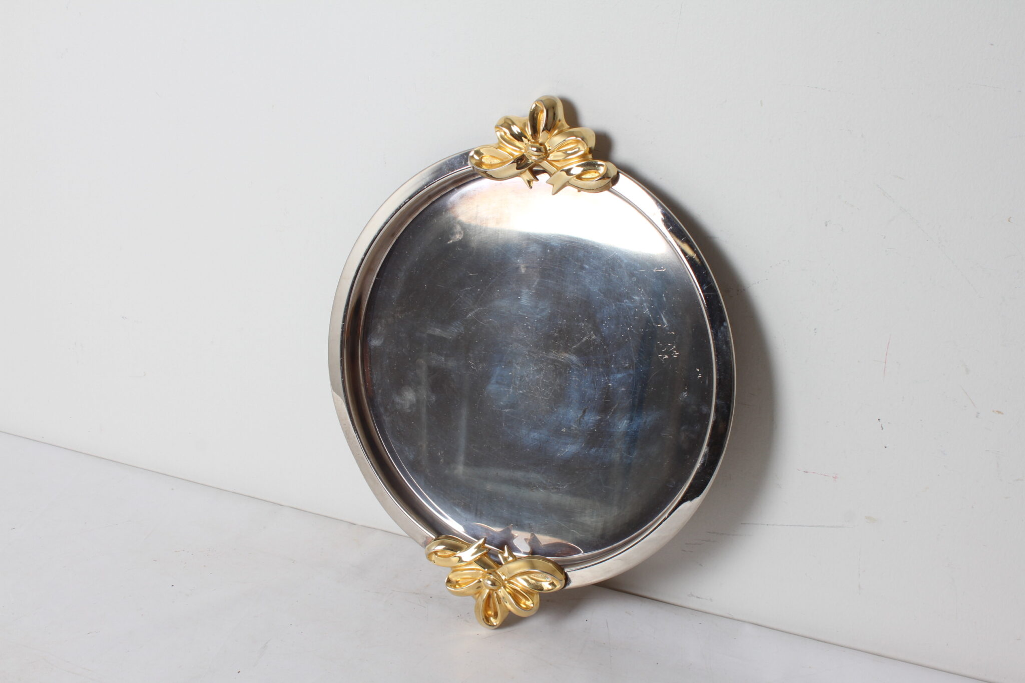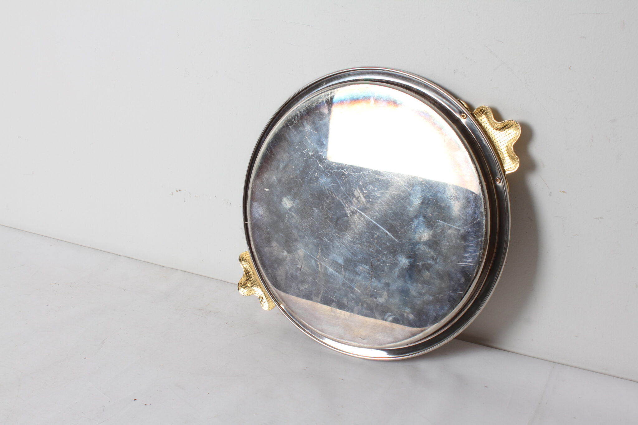 Plateau de service rond vintage en métal argenté et doré.