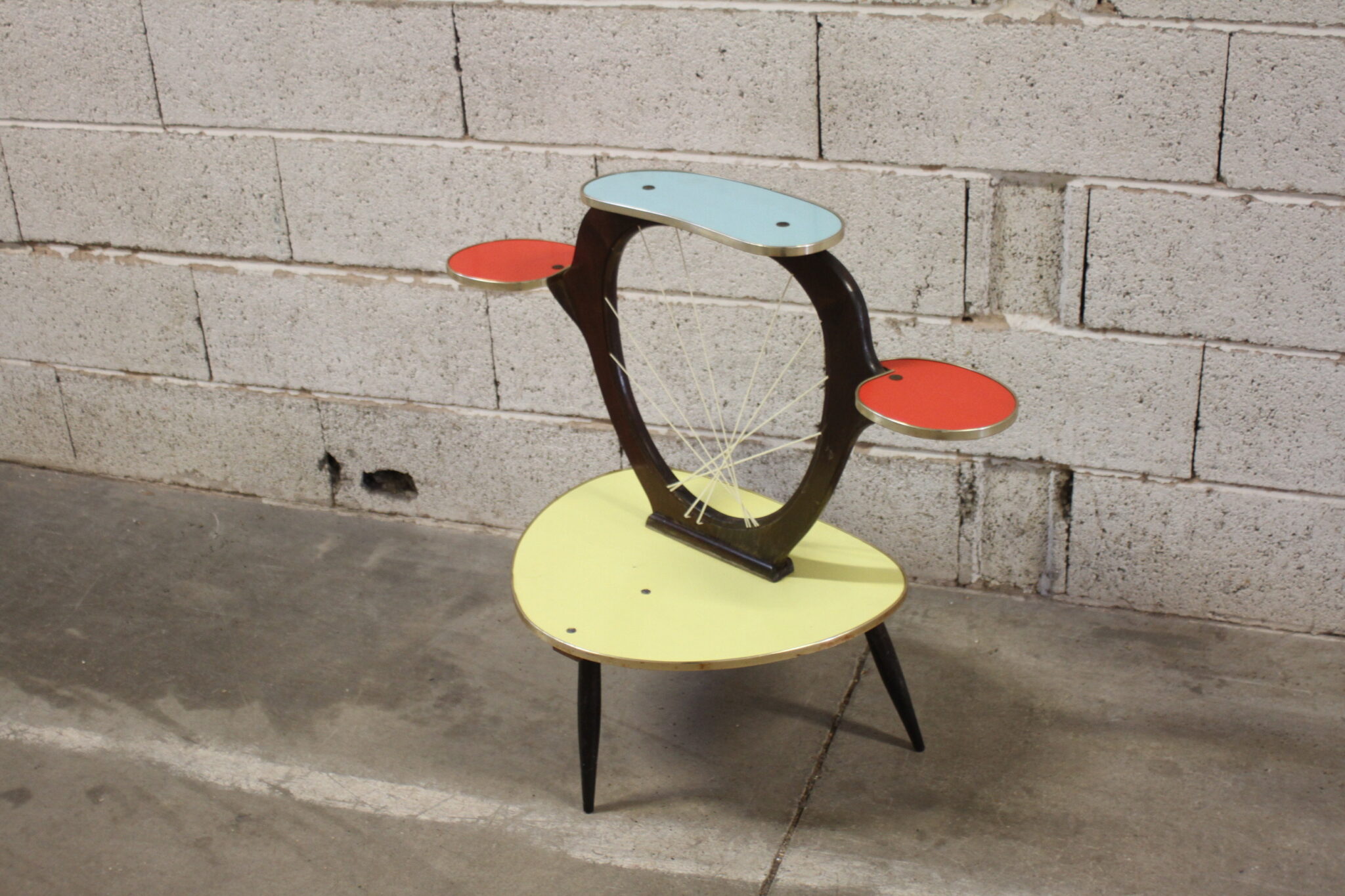 Porte plantes vintage tripode en bois et formica.