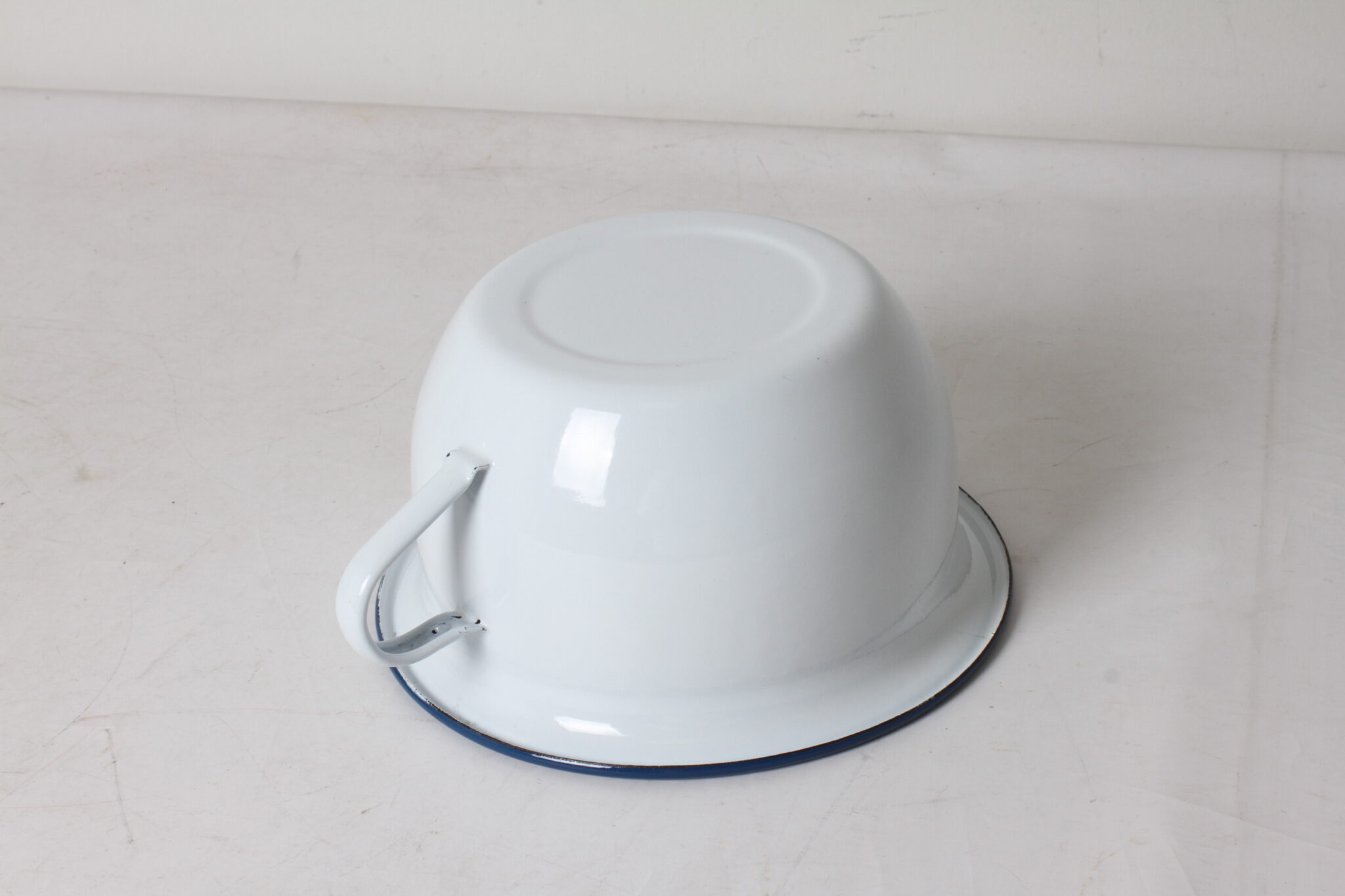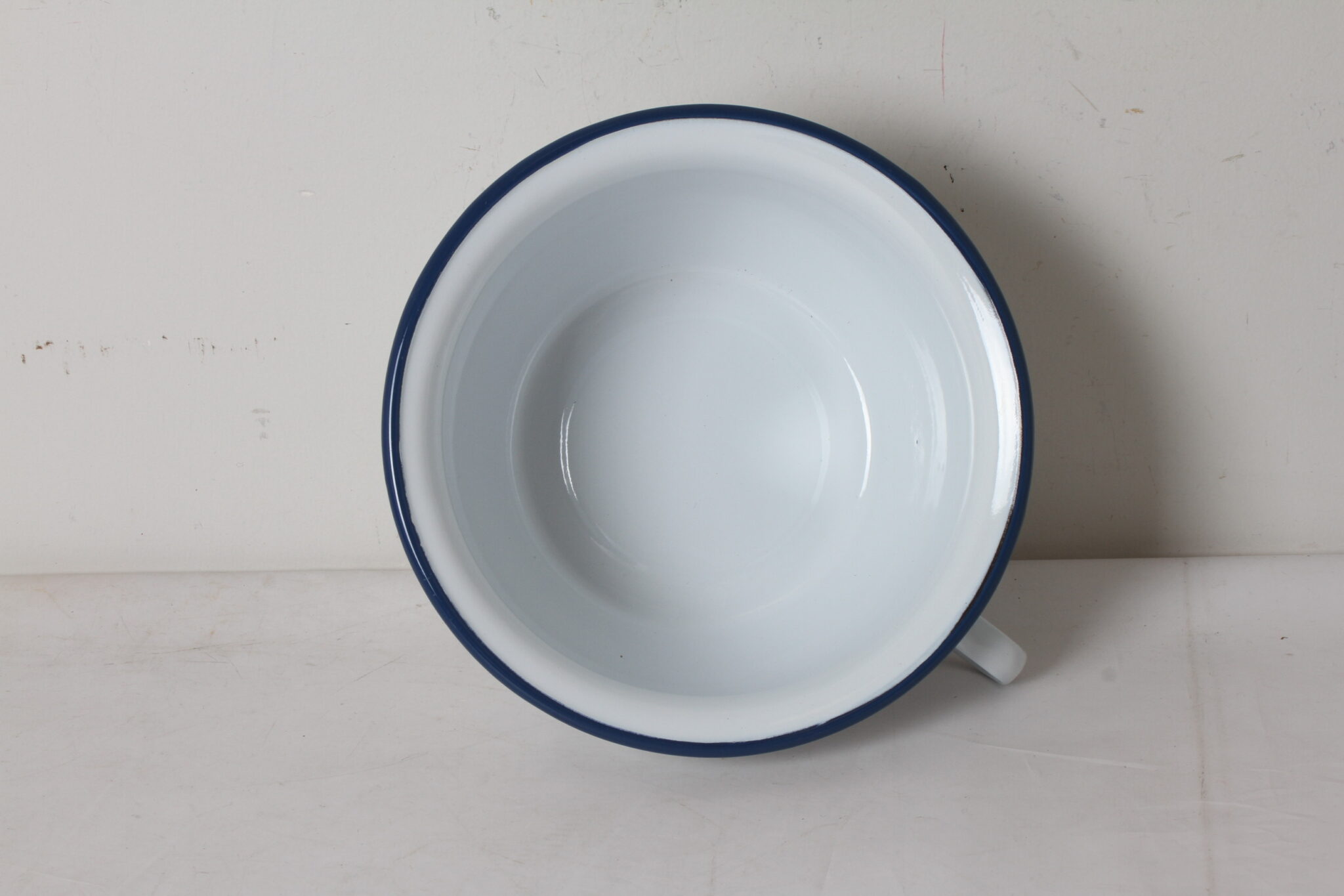 Pot de chambre en métal émaillé blanc avec liseré bleu.
