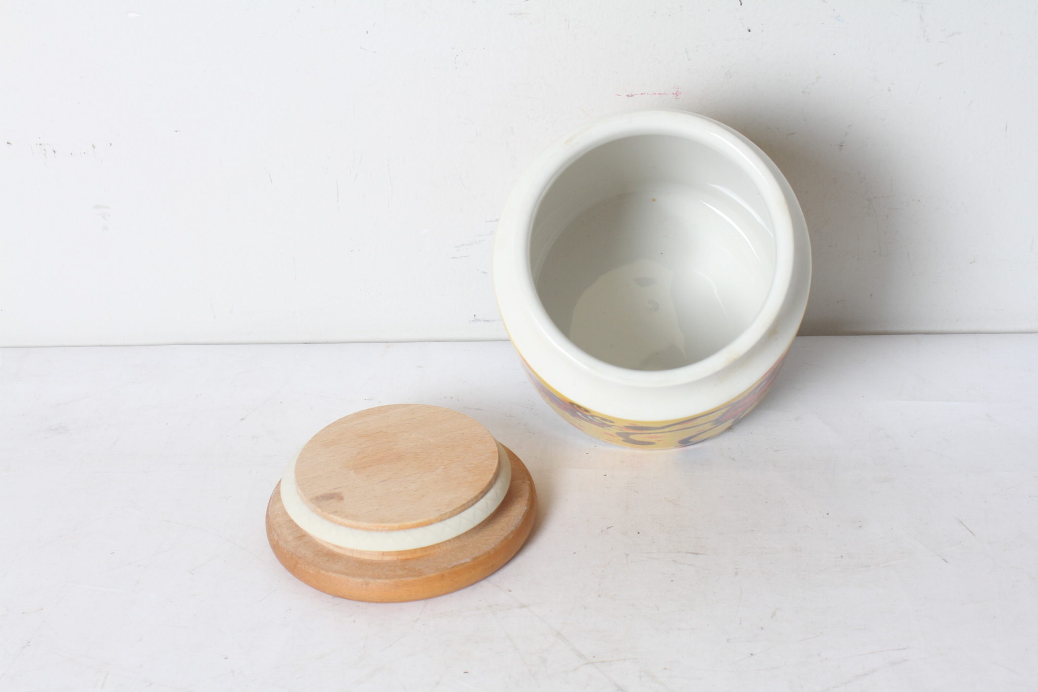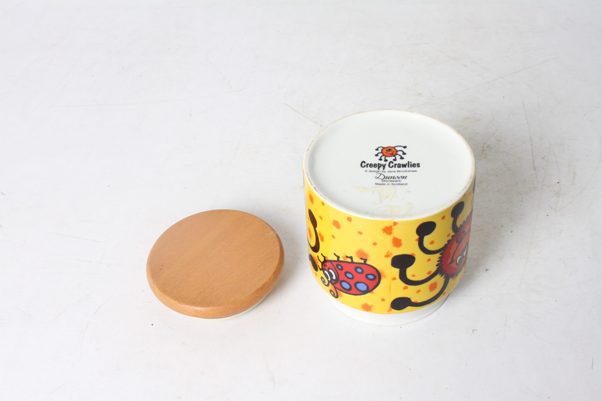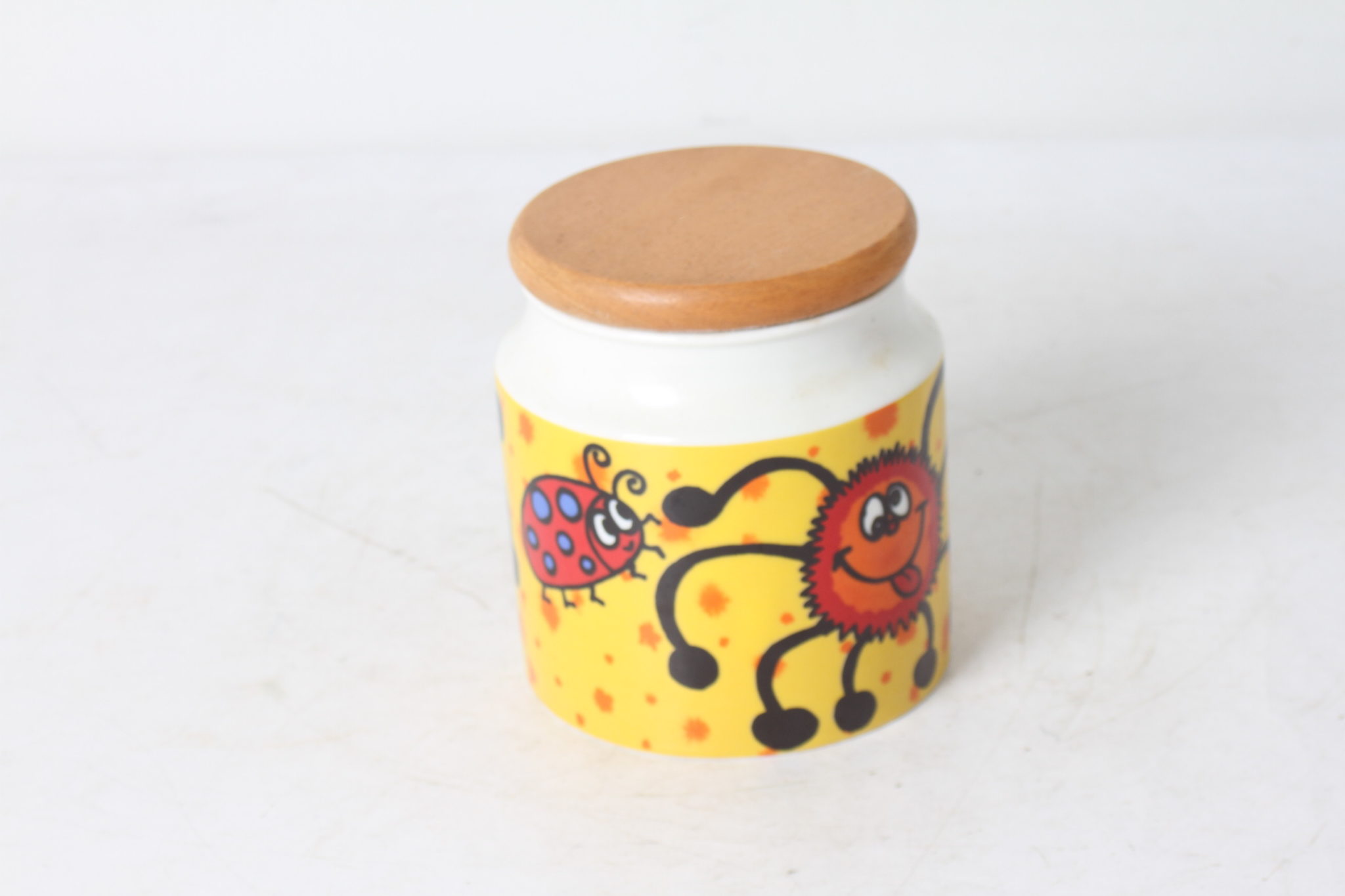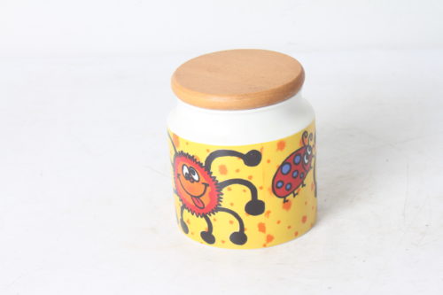 Joli pot décoré de jolies araignées multicolores, couvercle hermetique en bois.