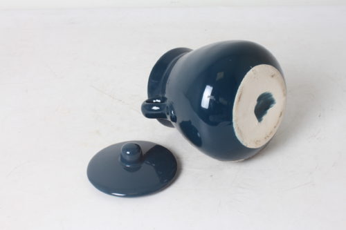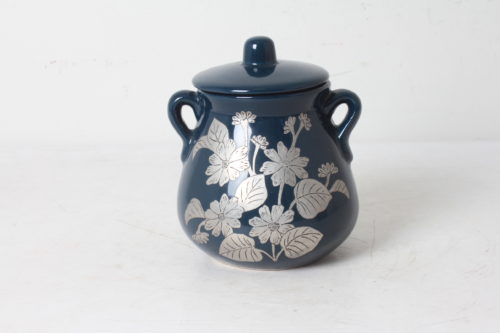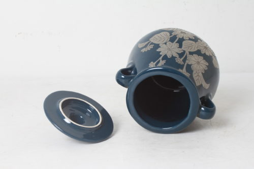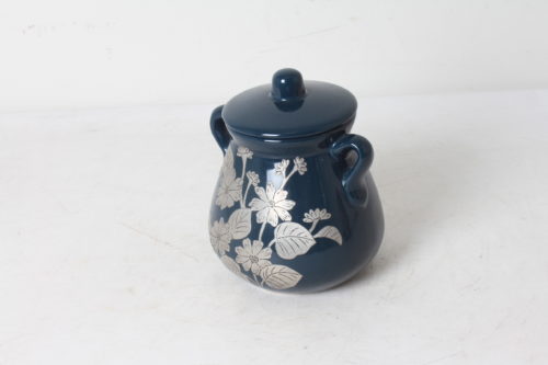 Pot décoratif ou poubelle de table en céramique bleue avec motif floral en feuille d’étain gravé.