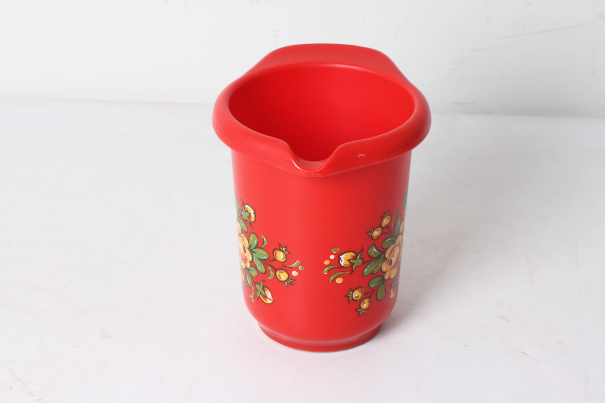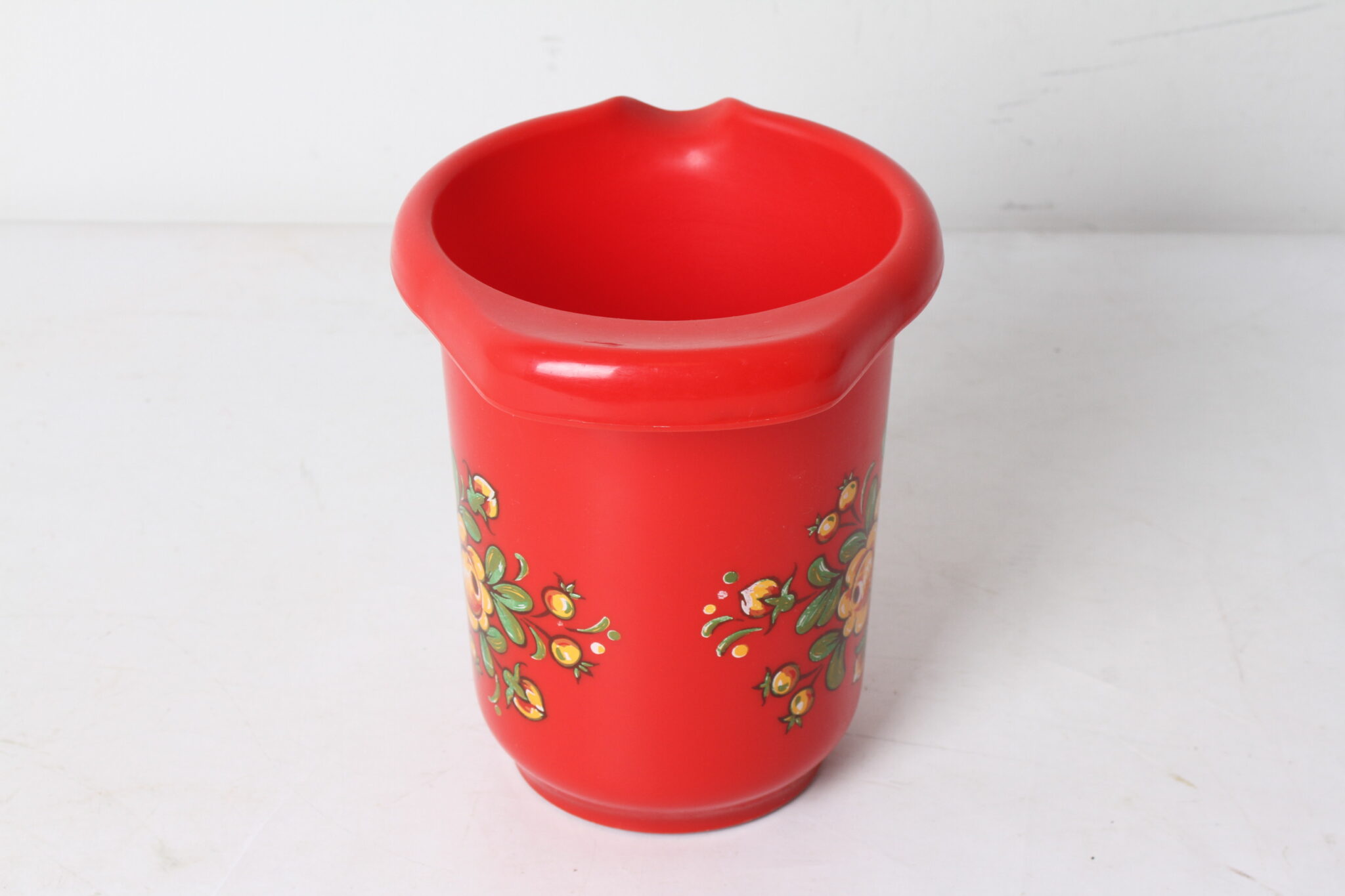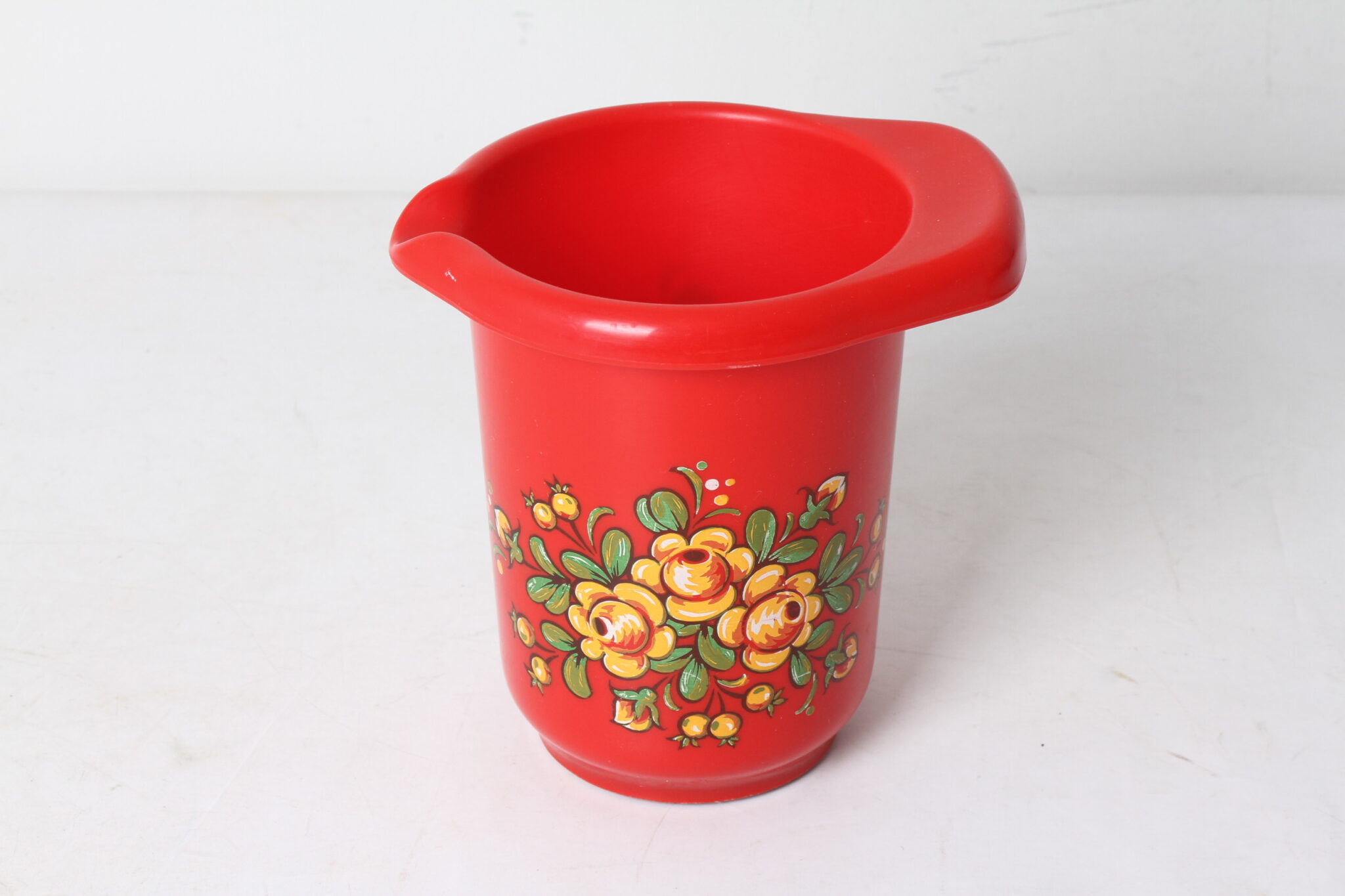 Pot en plastique rouge à décor floral.