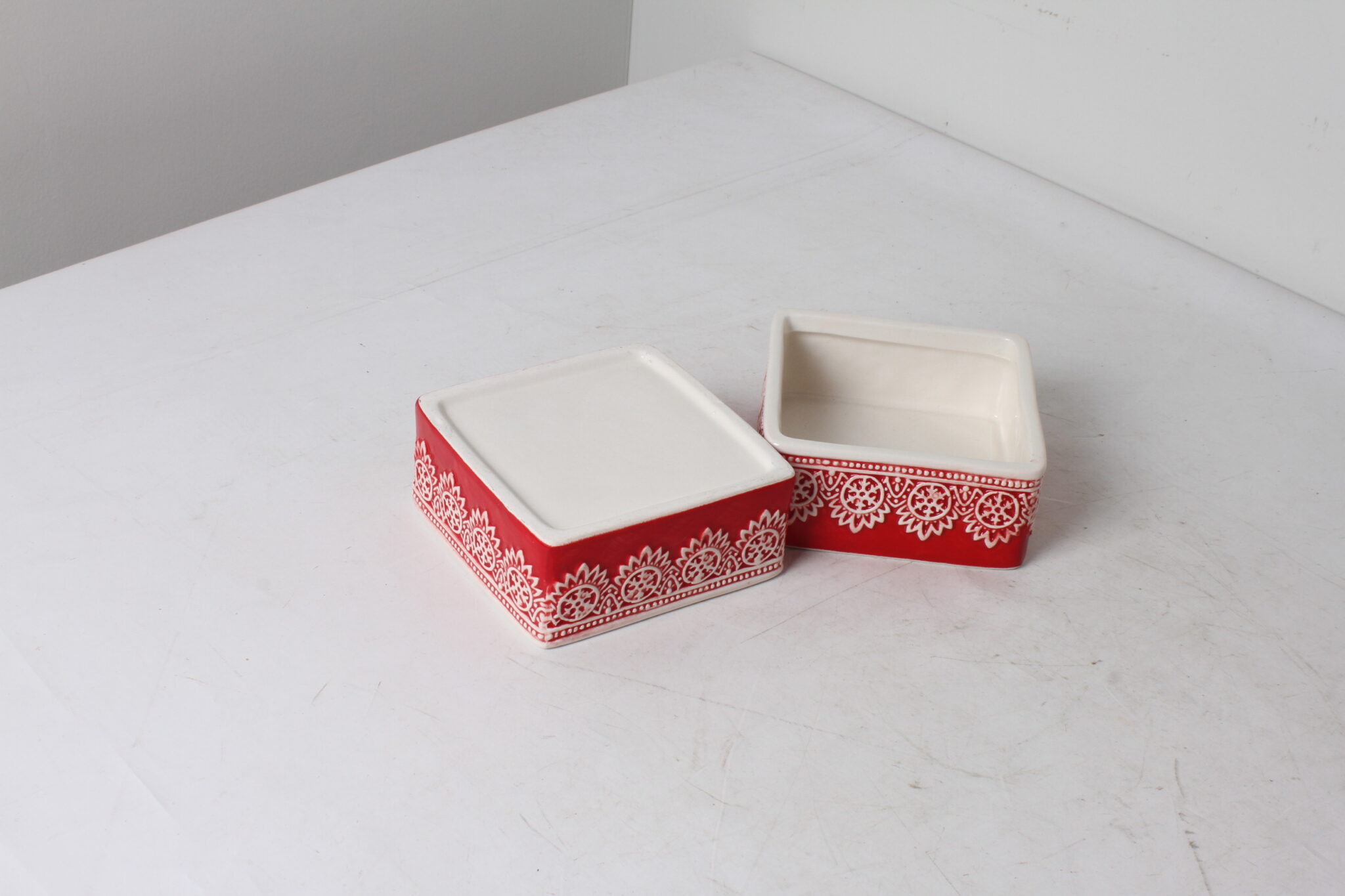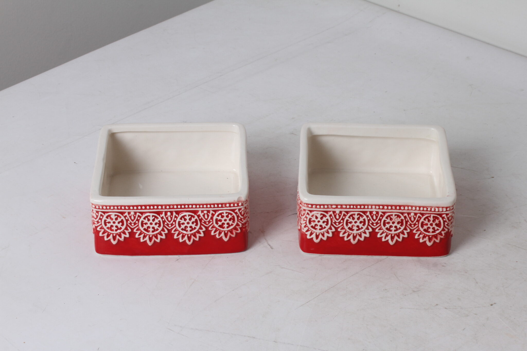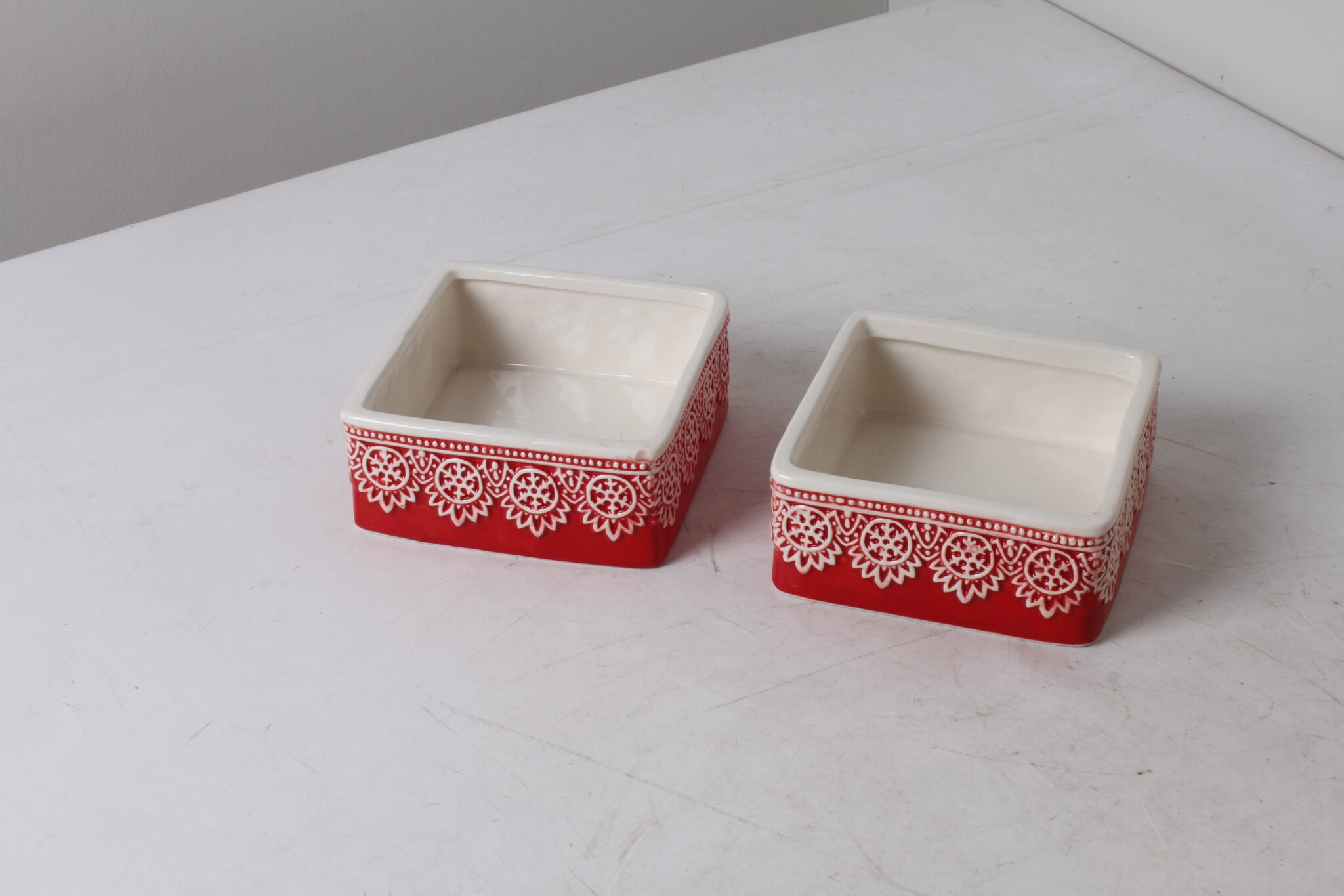 Paire de présentoirs carrés en céramique rouge avec décor blanc en relief.