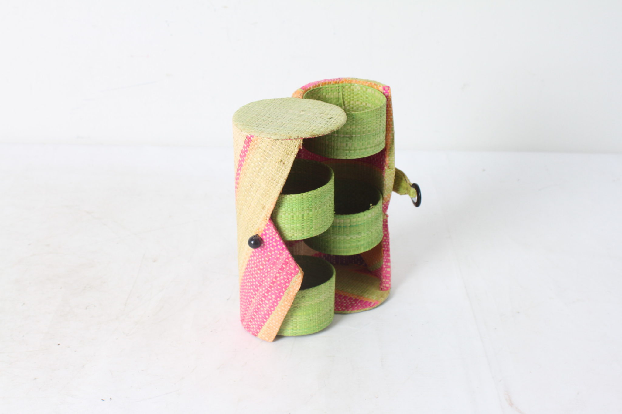 Rangement à bijoux en fibres synthétiques colorées.
