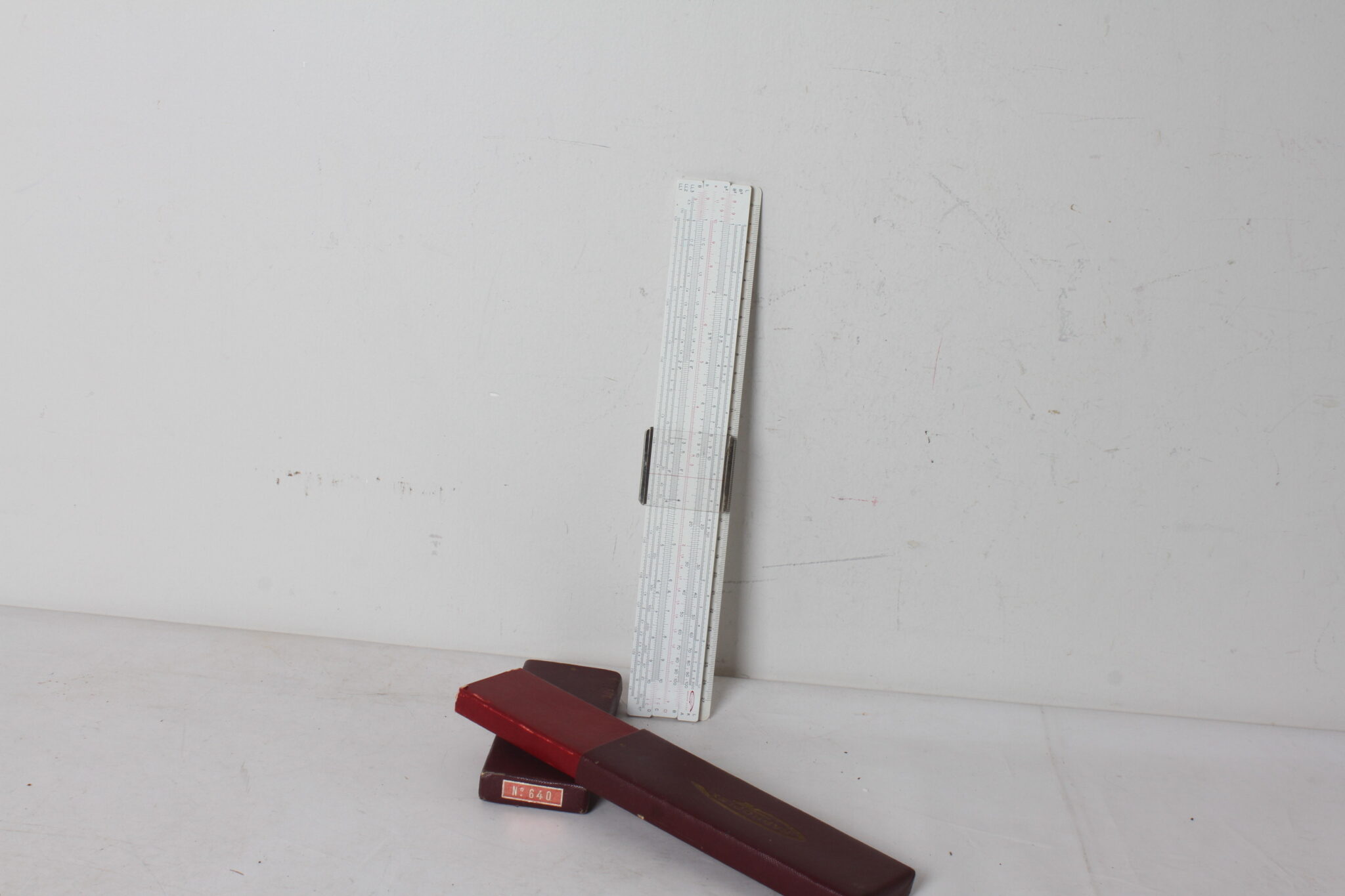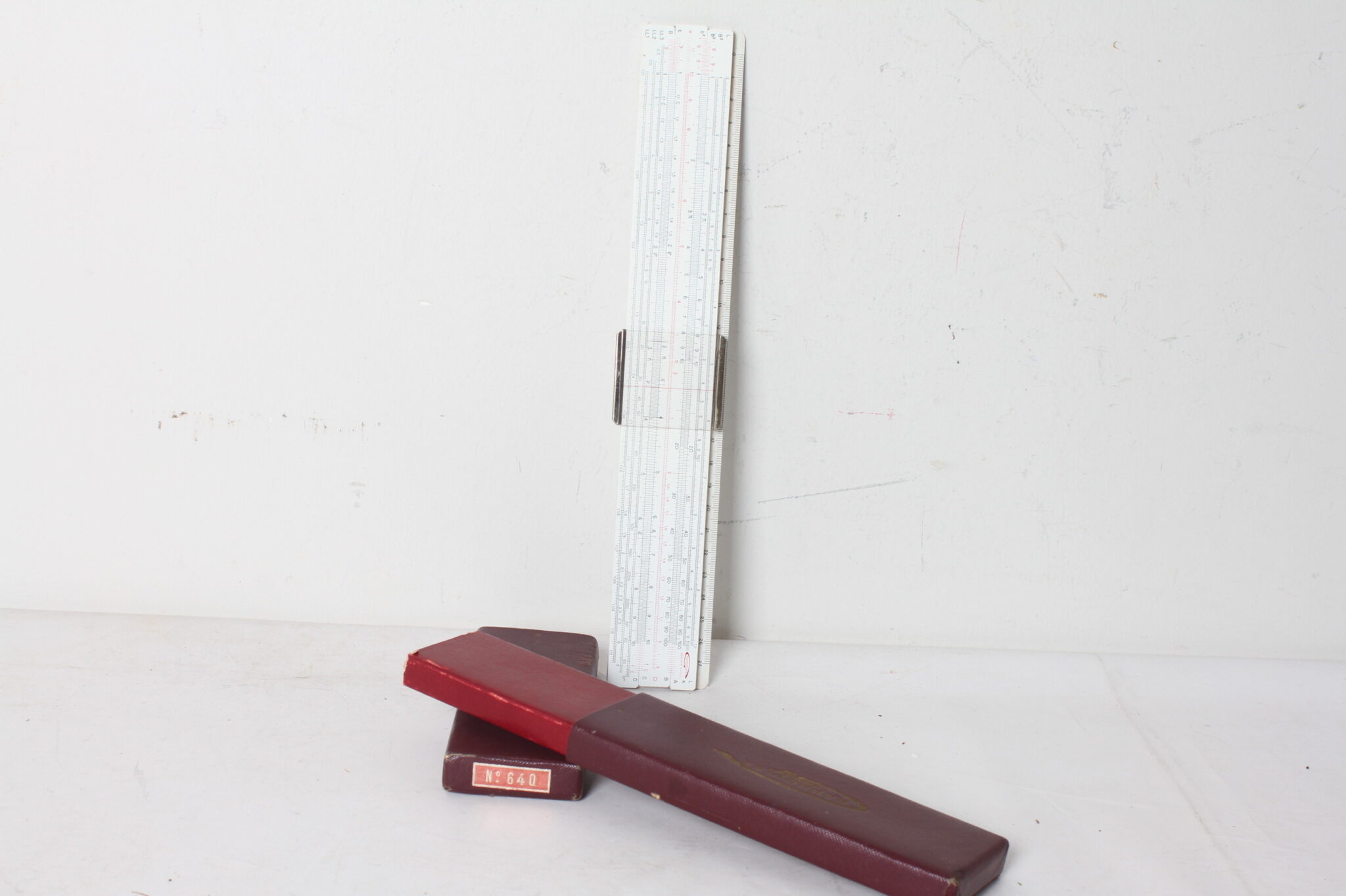 Ancienne règle de calcul de la marque Raphoplex, dans son étui.
