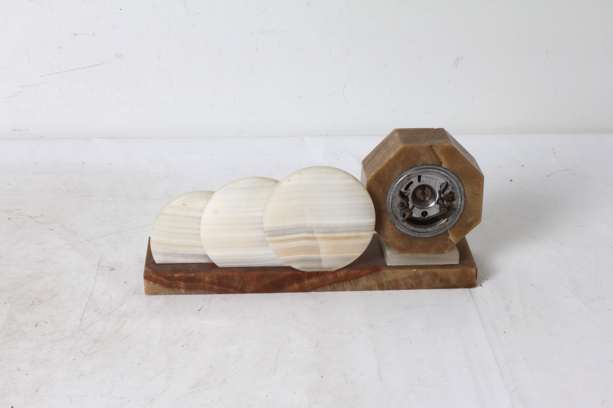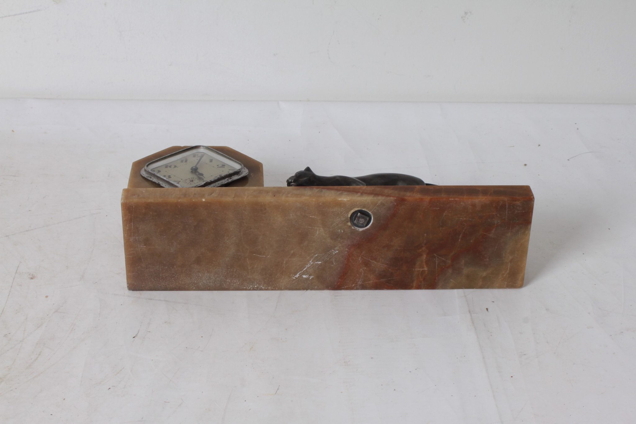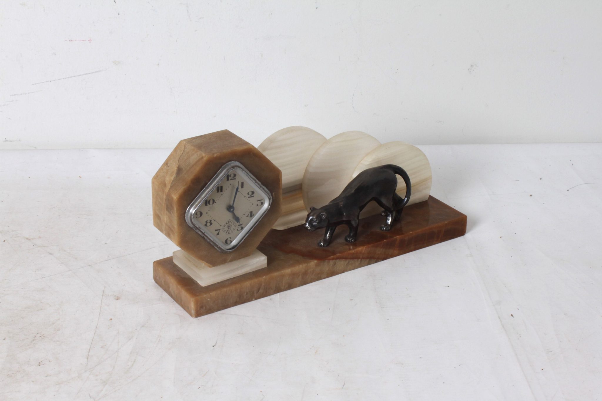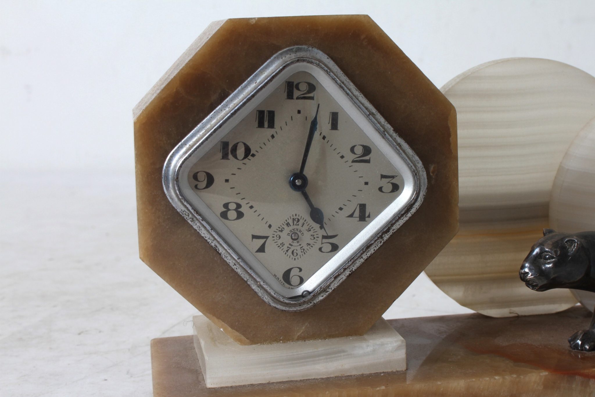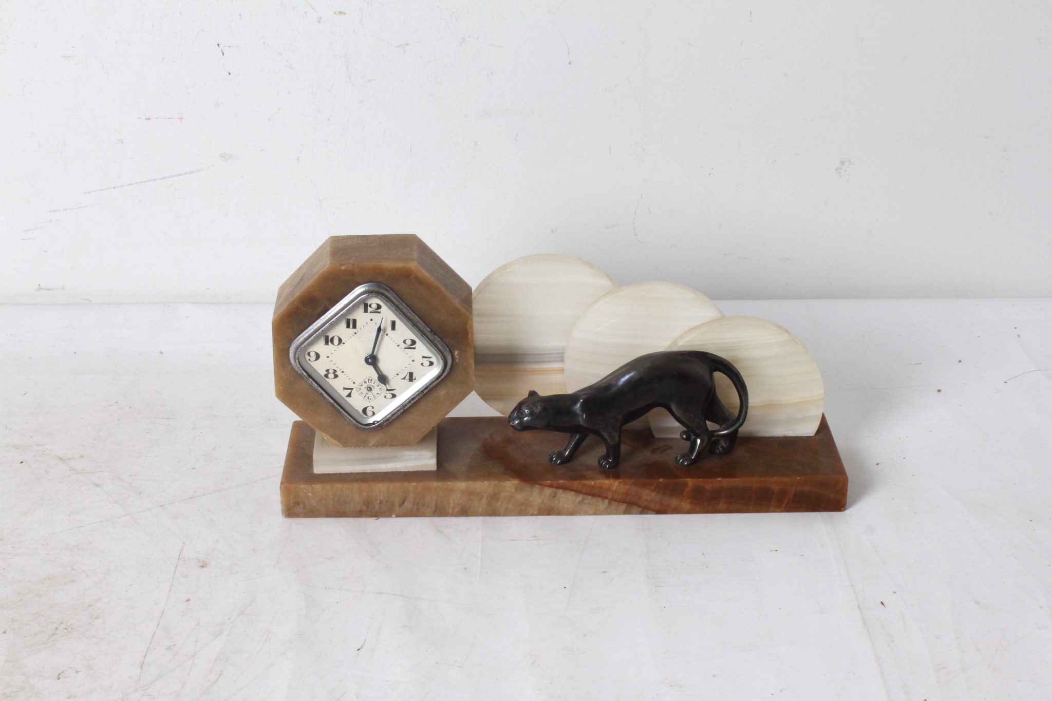 Très belle pièce Art Déco , socle et montant du réveil en marbre ; Réhaussée de décorations en pierre blanche.