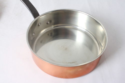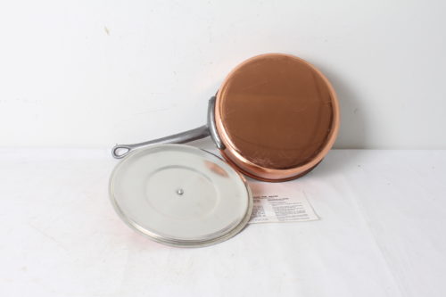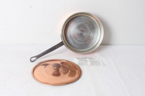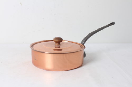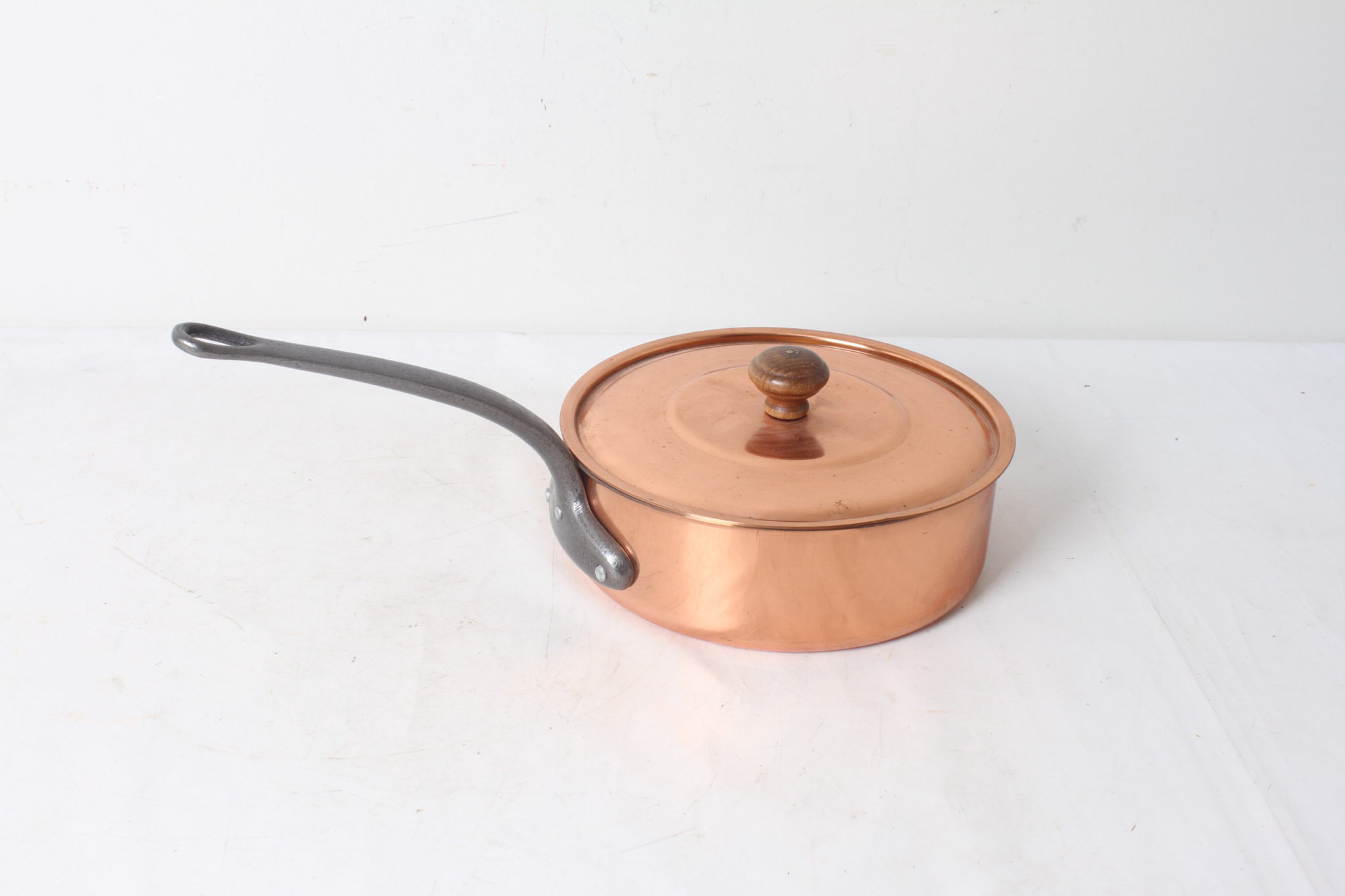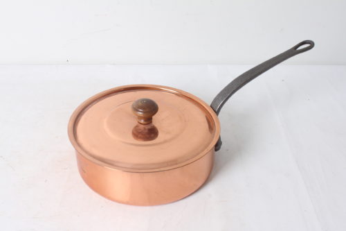Sauteuse en cuivre étamé Ø 23 cm avec queue en fonte et couvercle en cuivre.