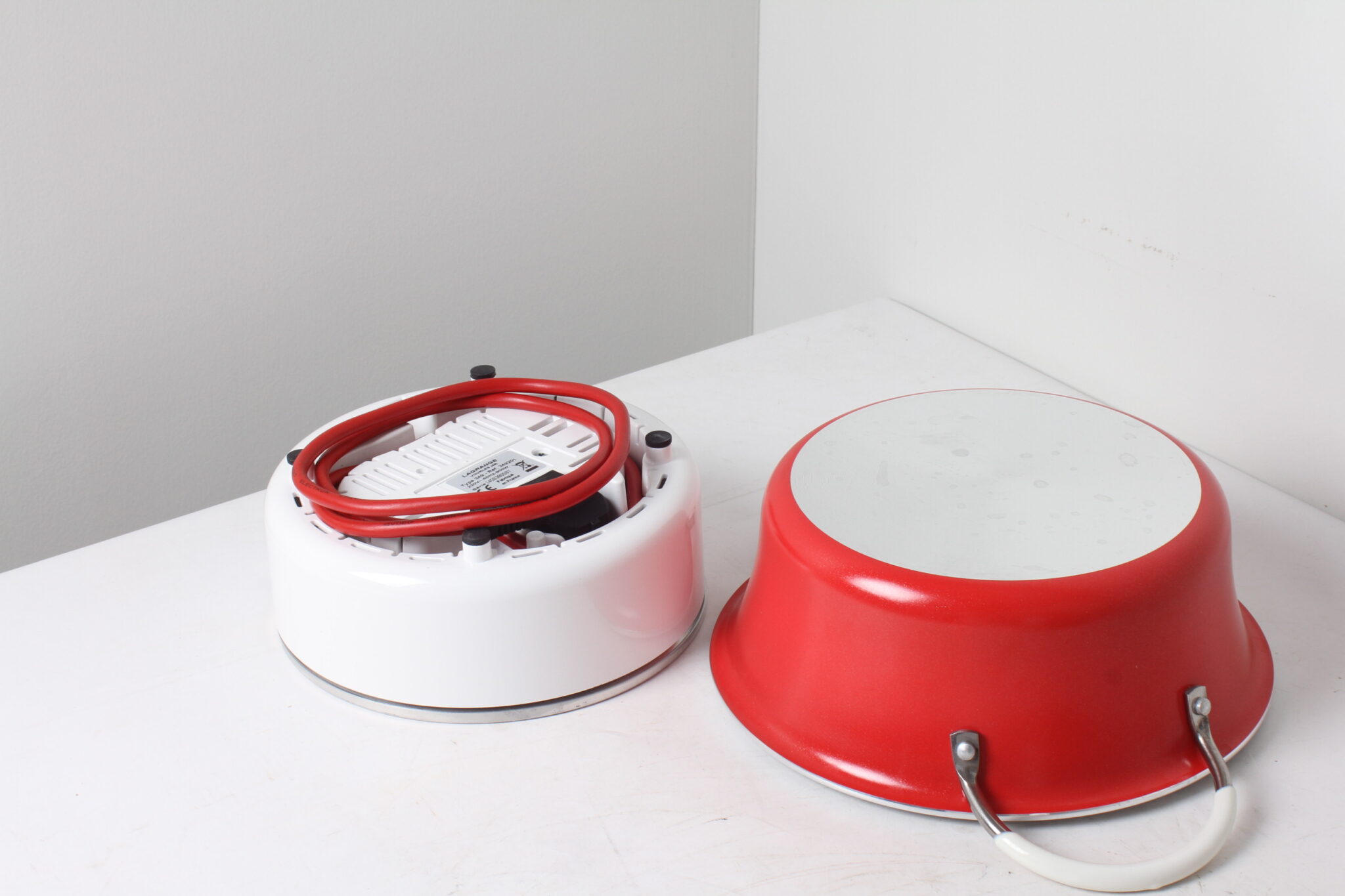 Thermostat réglable avec voyant lumineux, cordon fixe rouge et range cordon intégré.