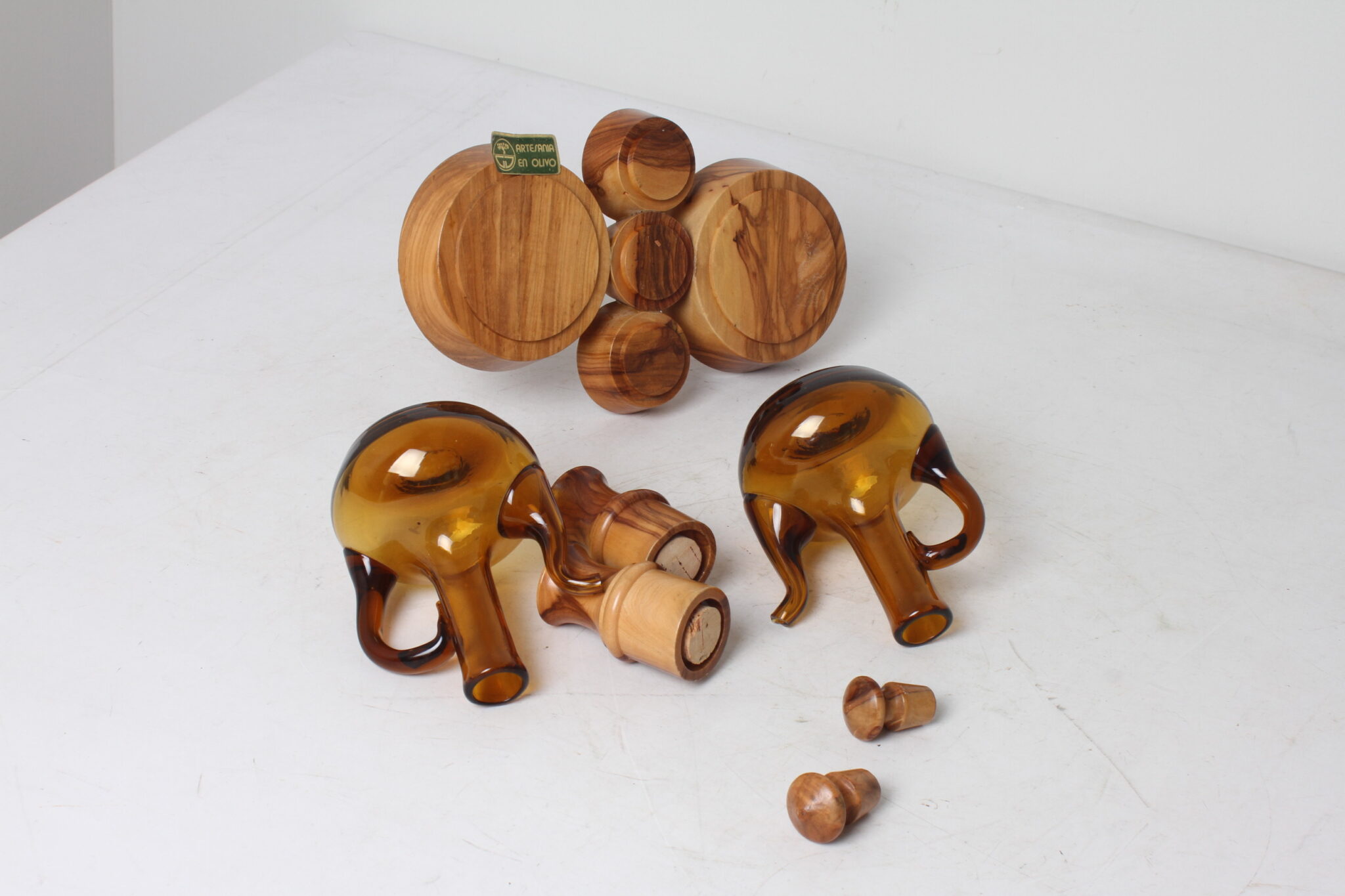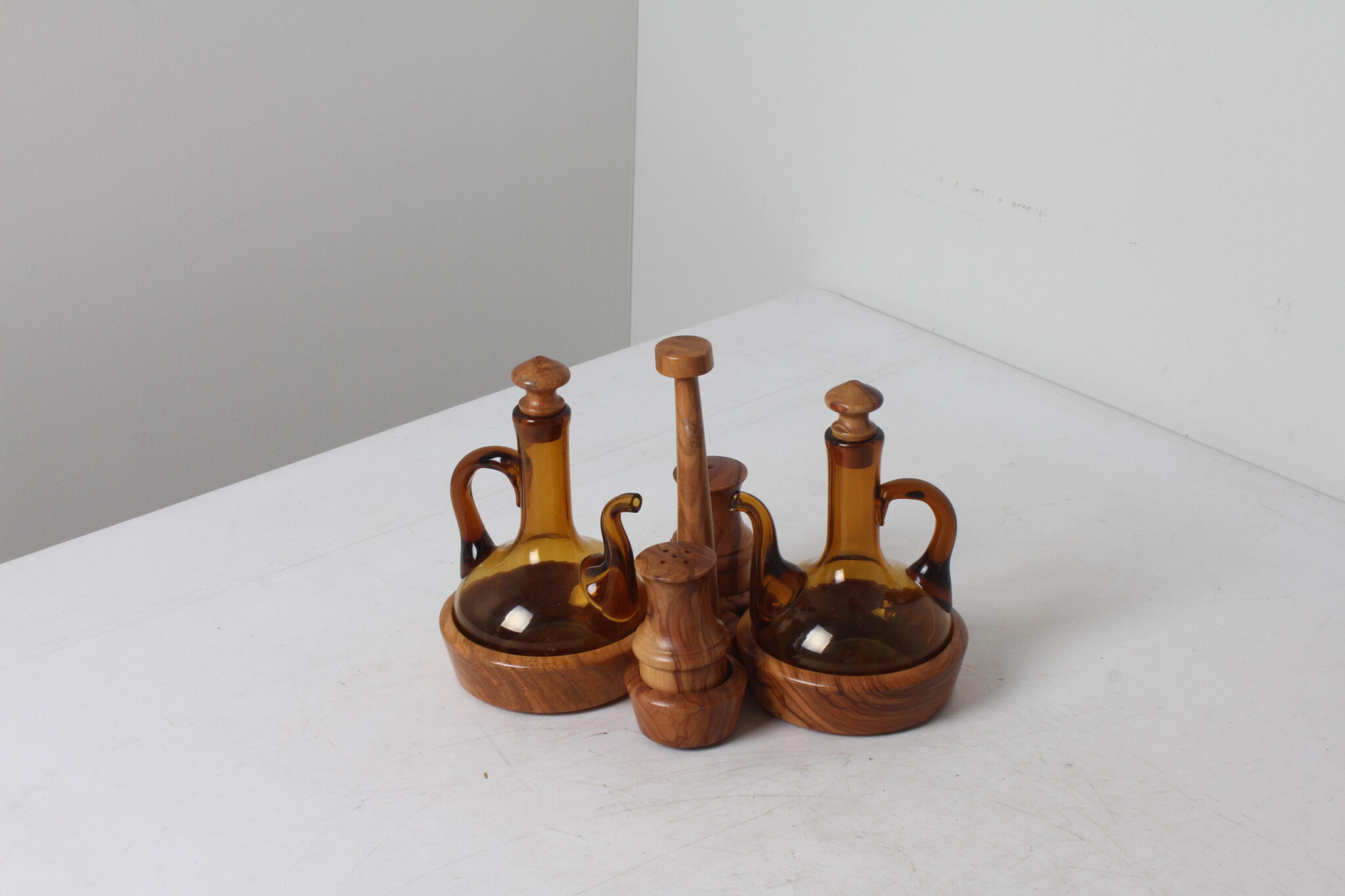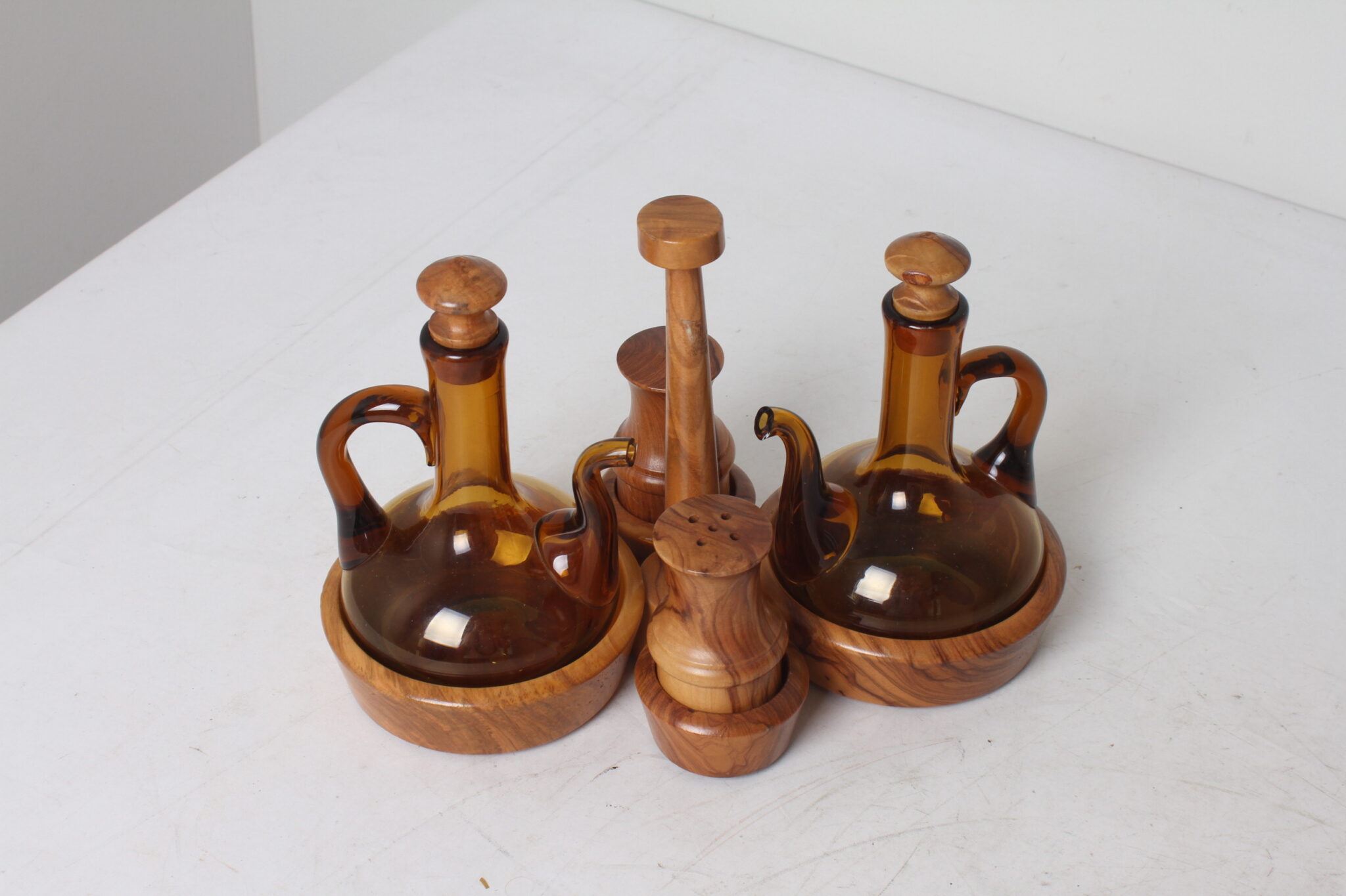 Serviteur à condiments en bois d’olivier et verre ambré.