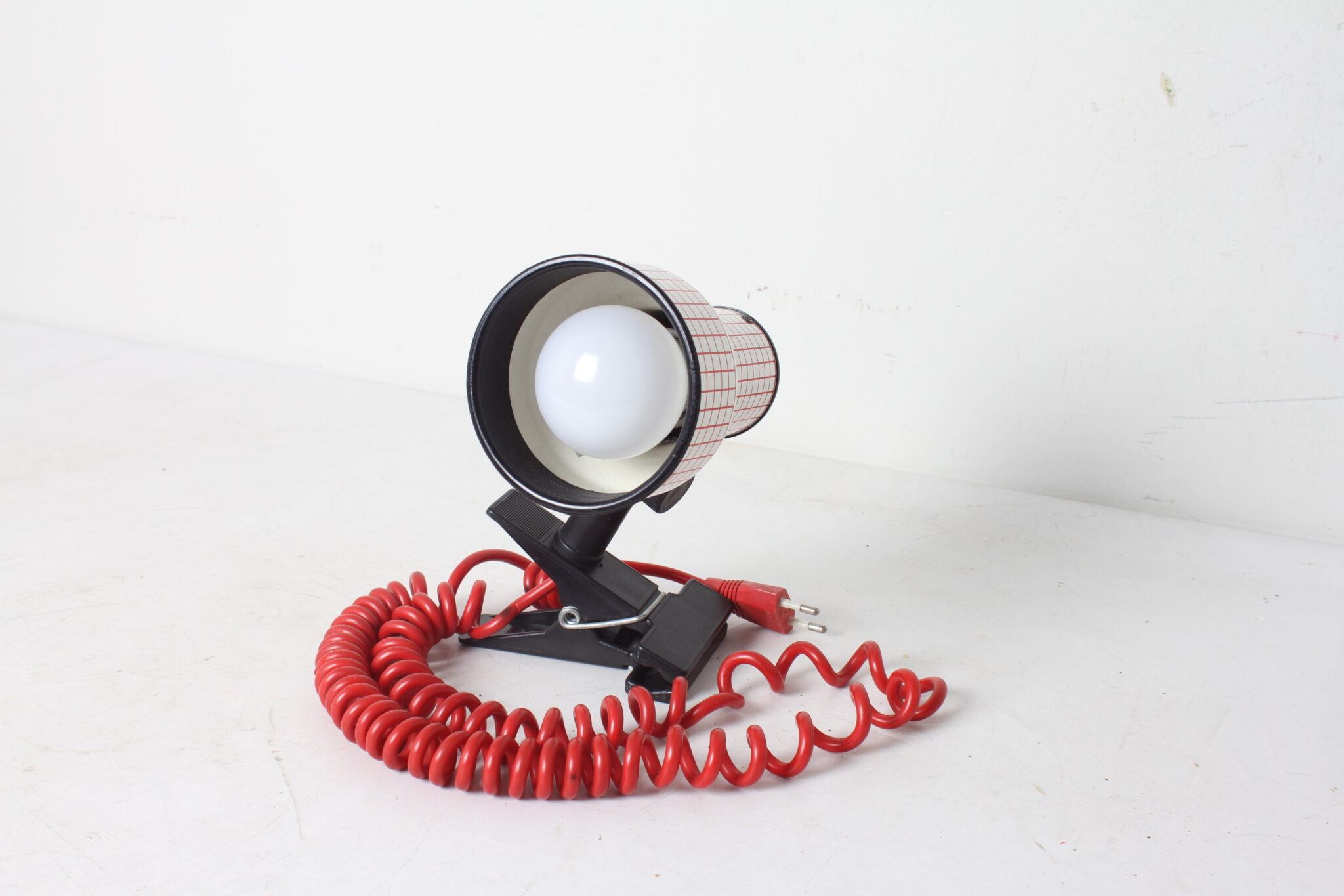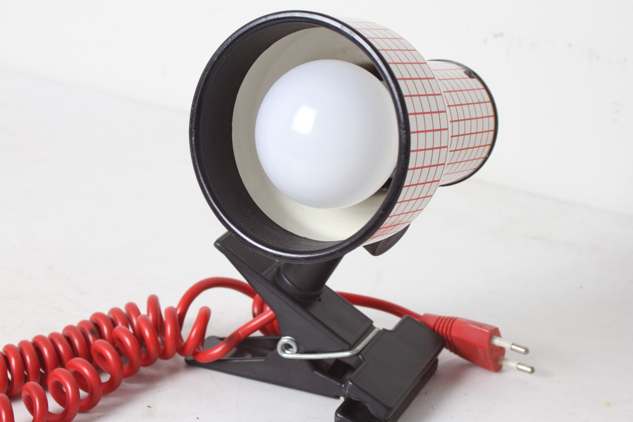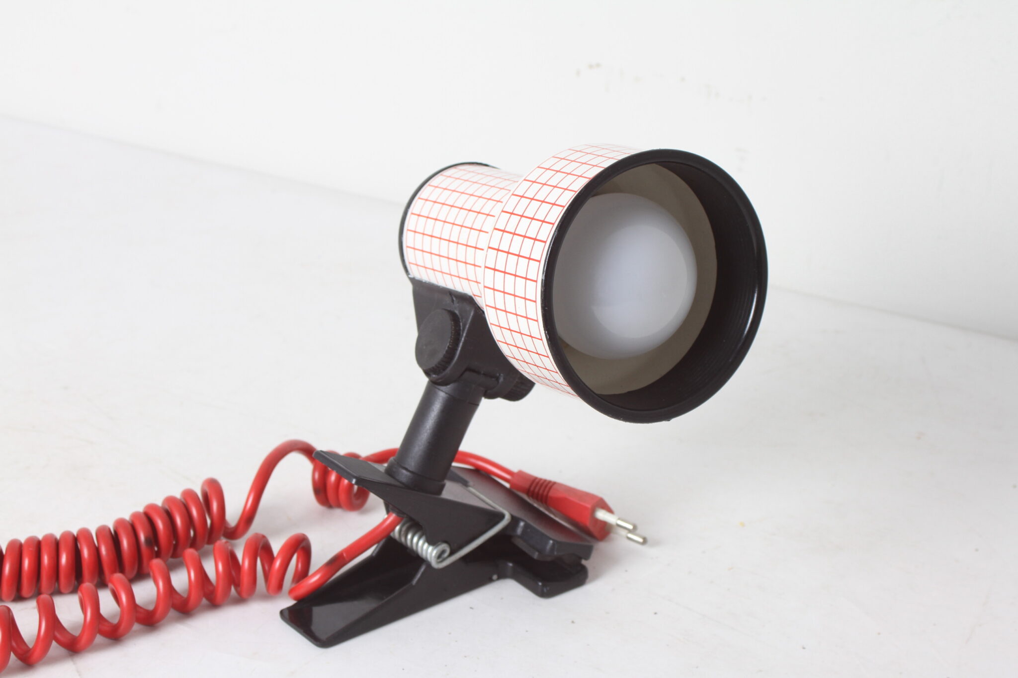 Spot pop art vintage à pince, orientable, en métal blanc et rouge et plastique.