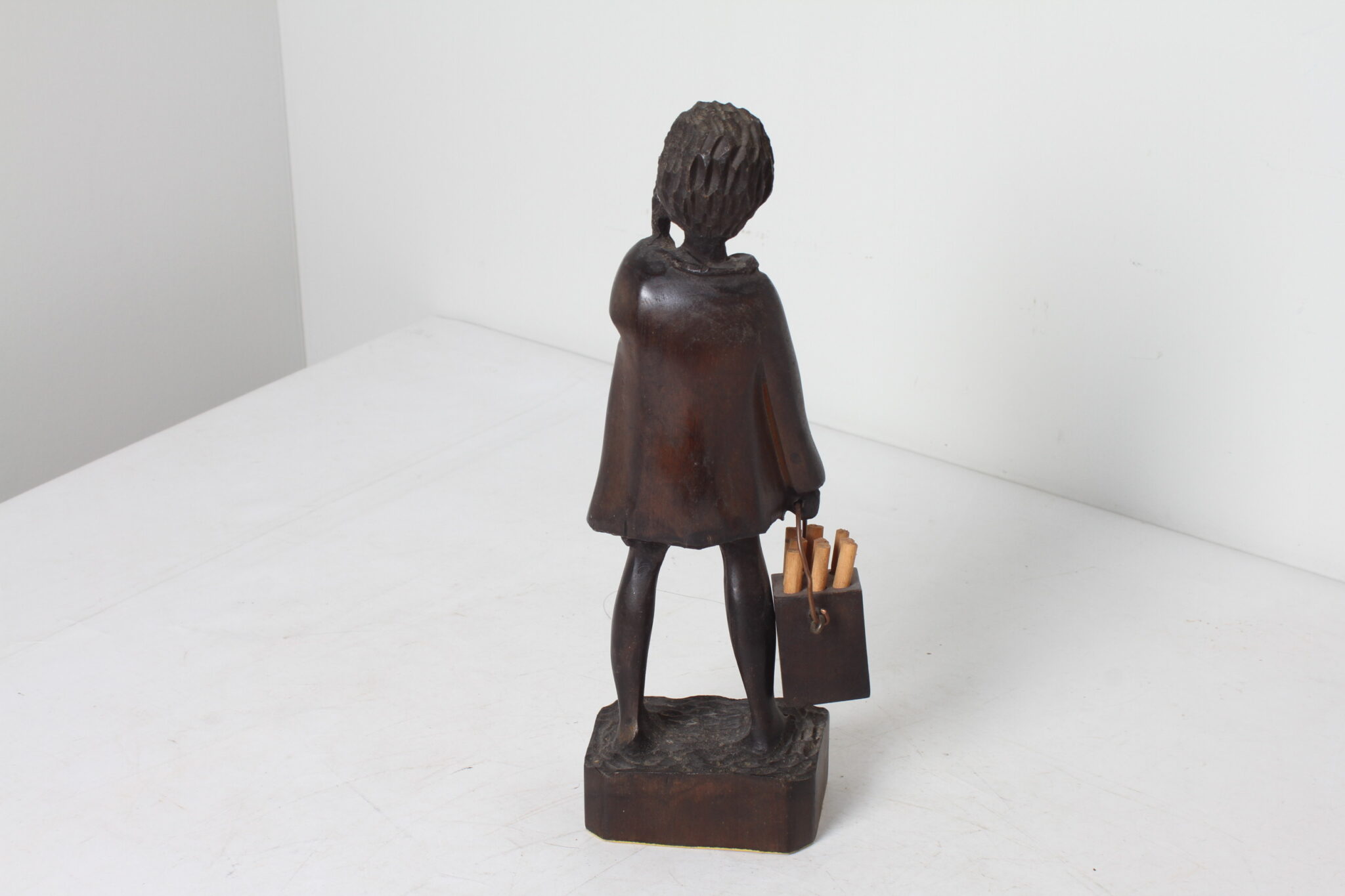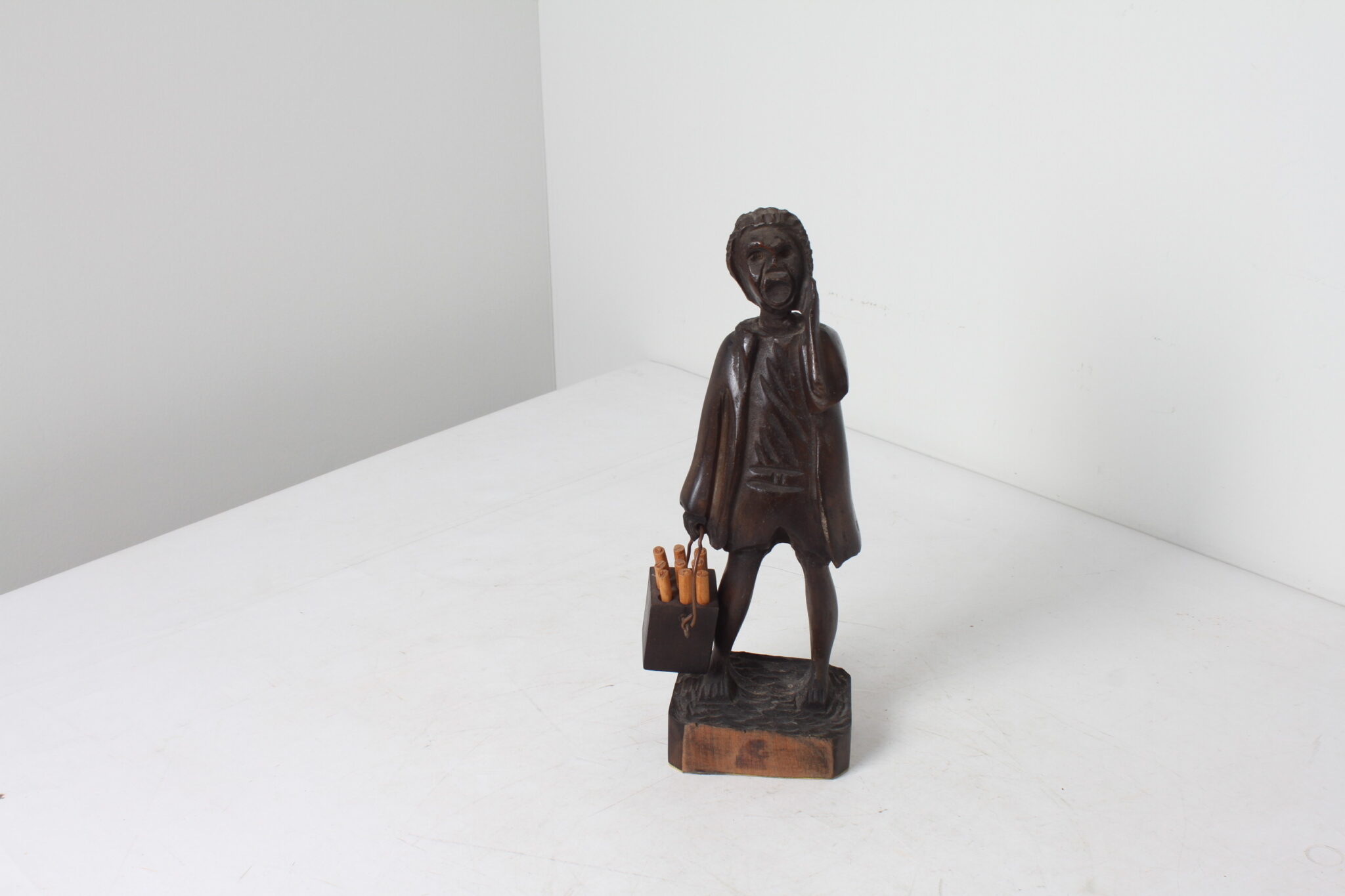Statue décorative en bois représentant un homme avec un seau à la main et qui crie.
