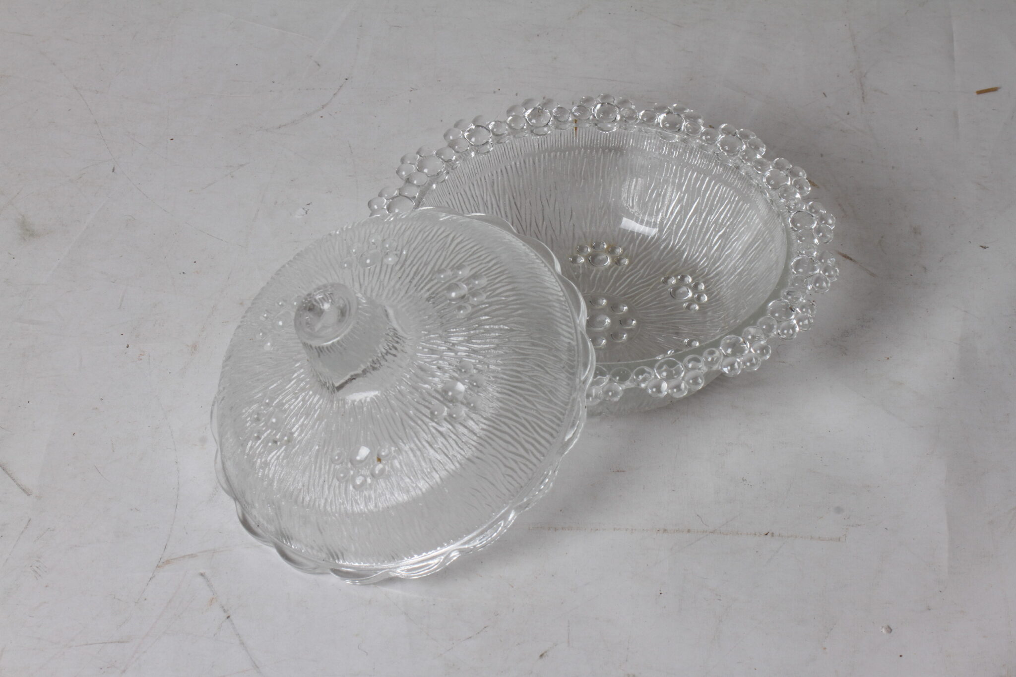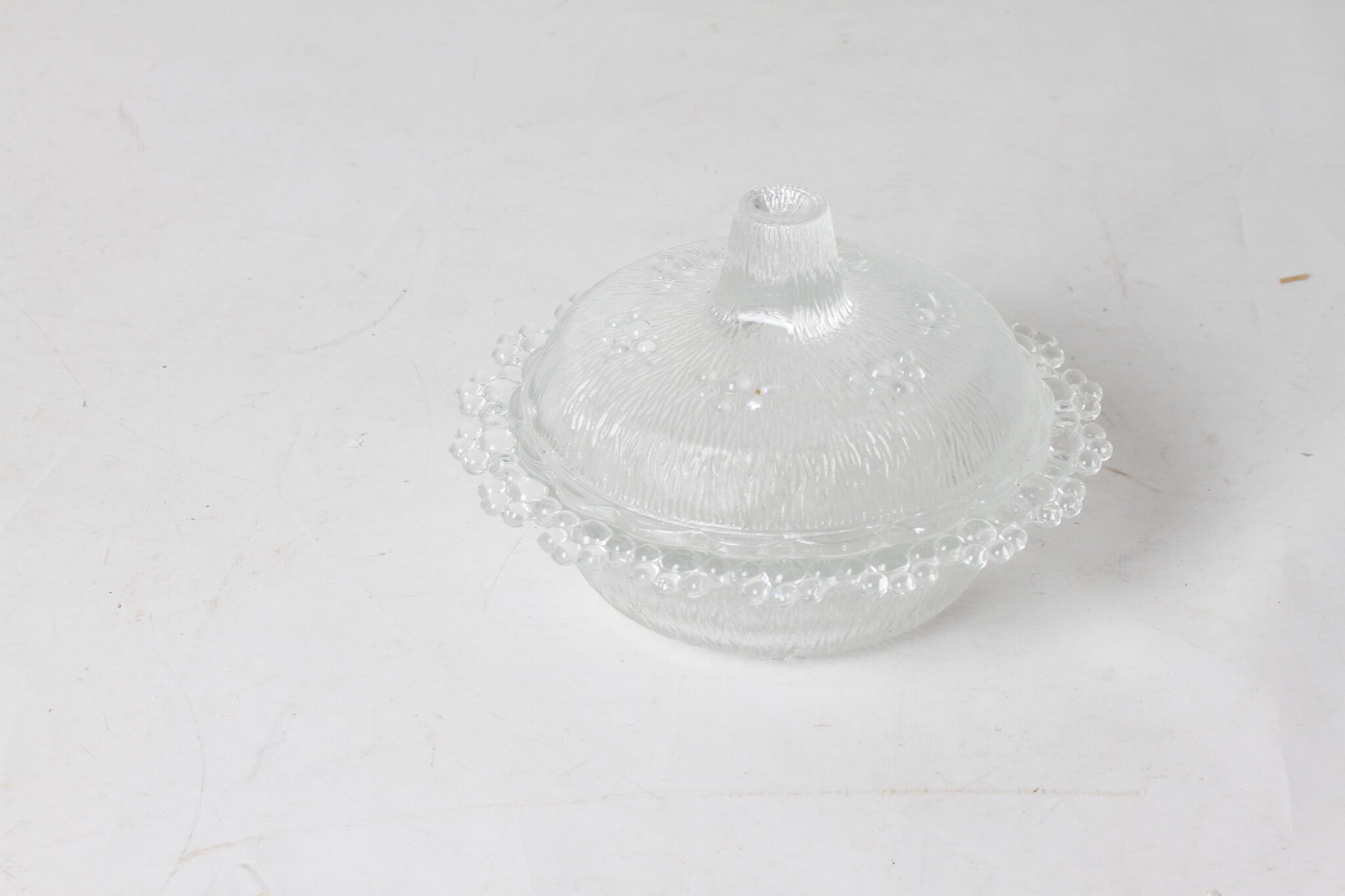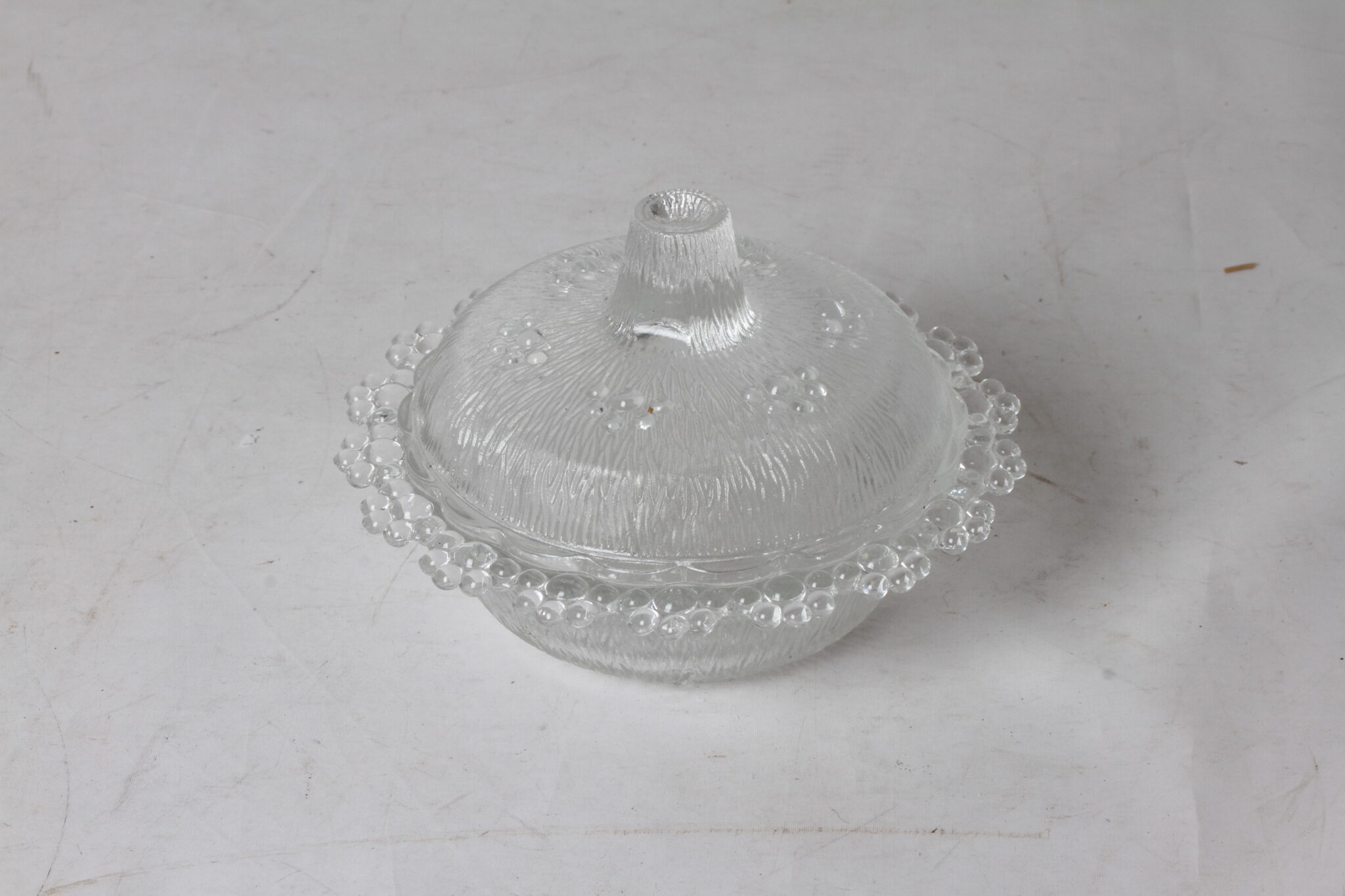 Élégant sucrier vintage rond en verre moulé avec décor en relief.