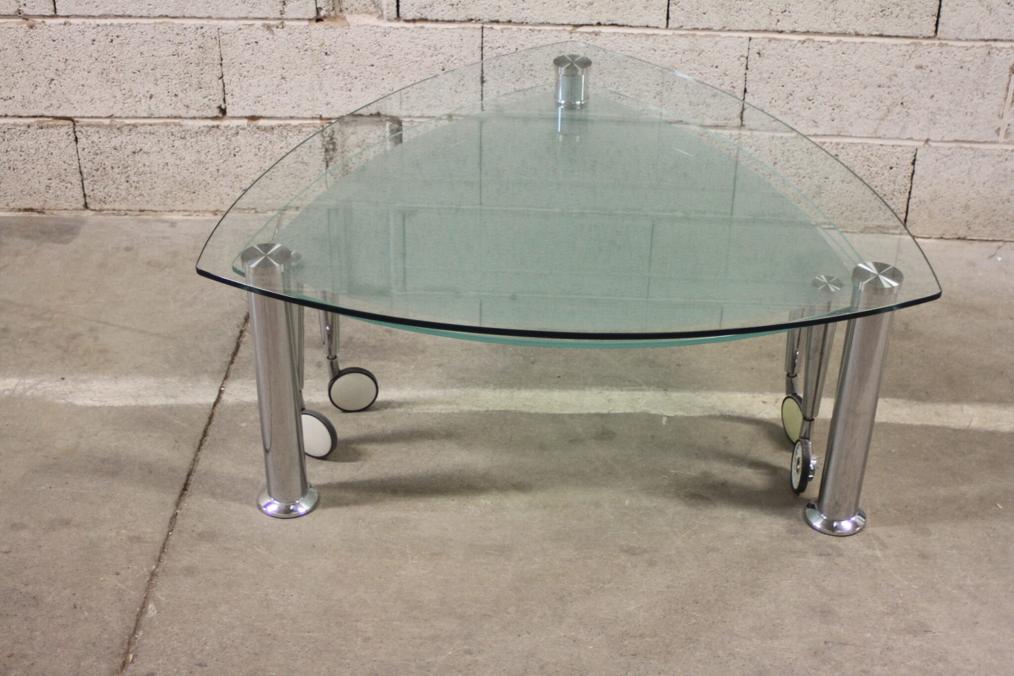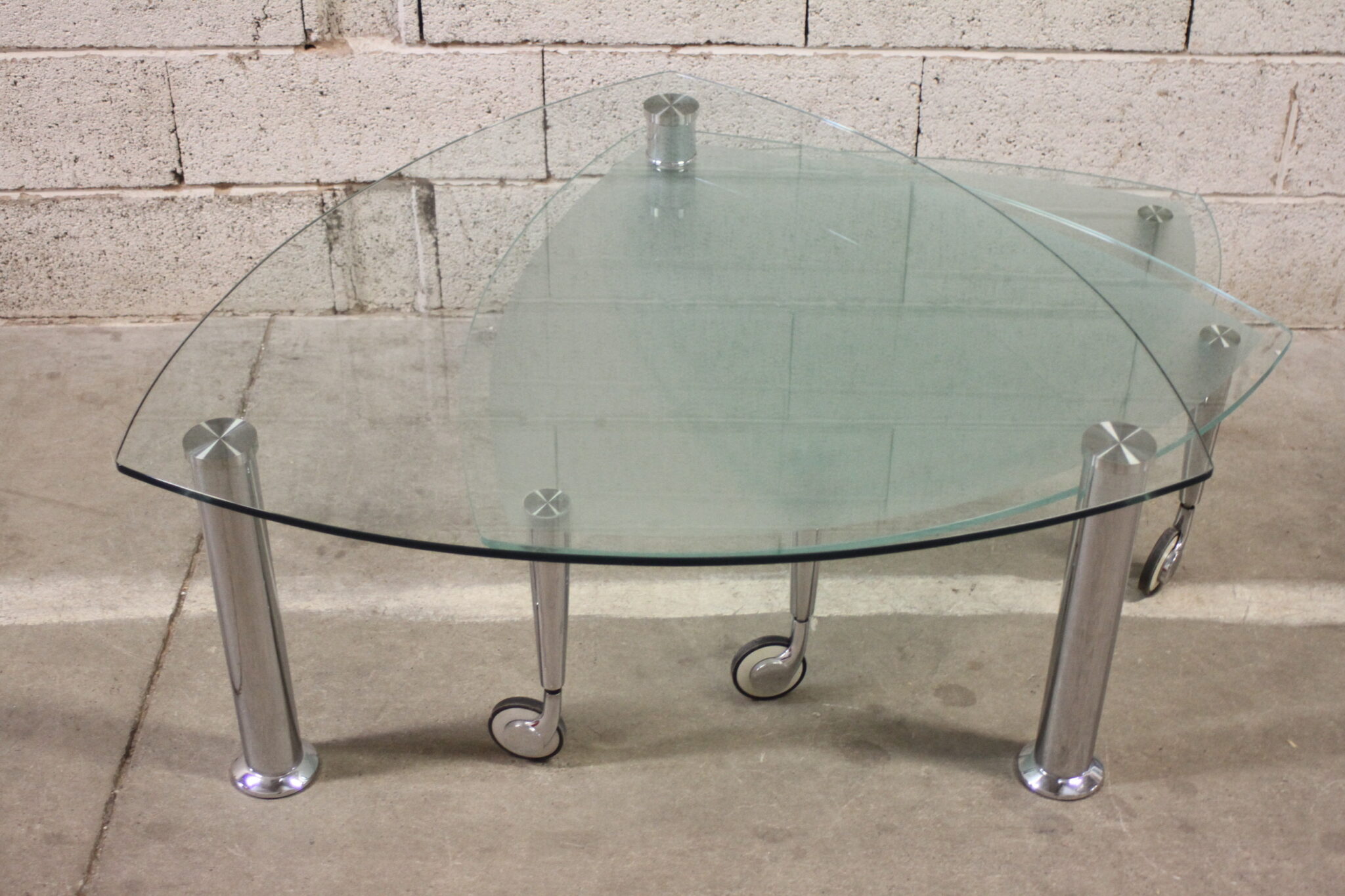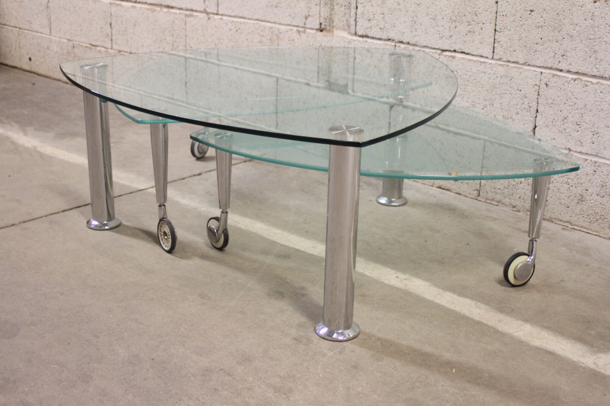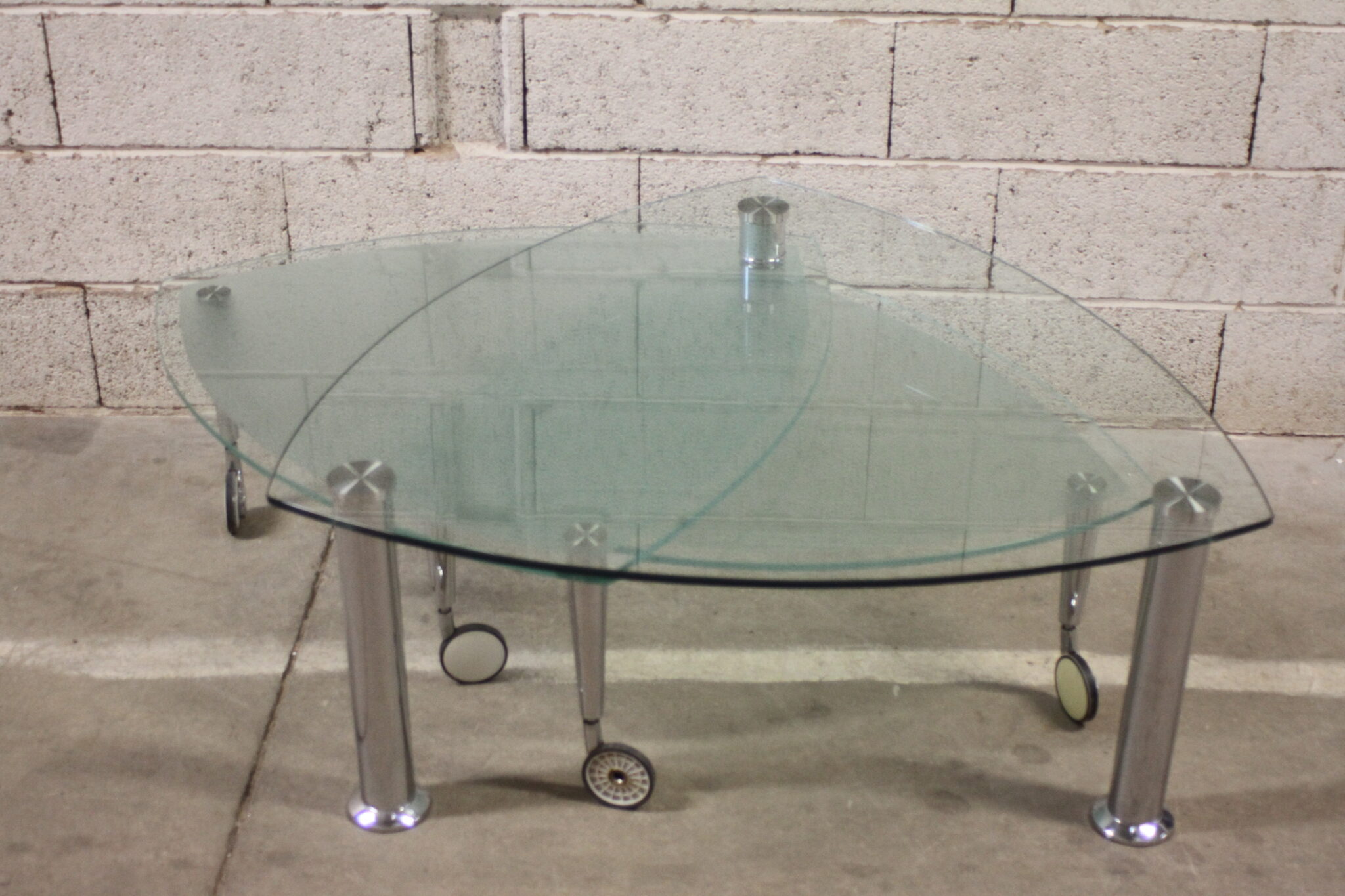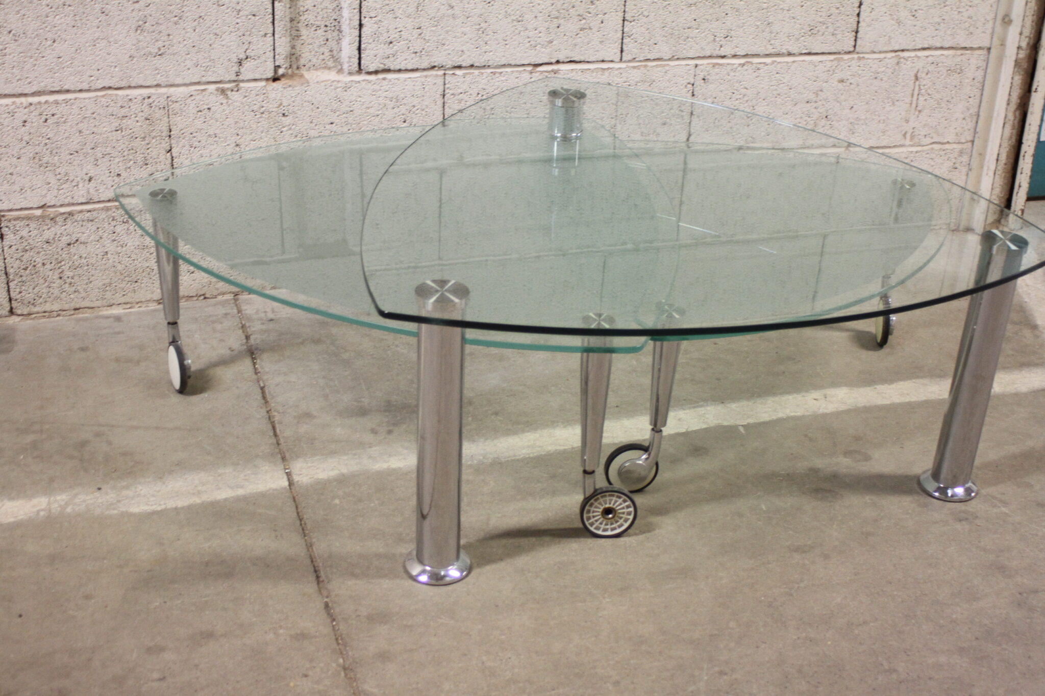 Table de forme triangulaire extensible avec ses 2 plateaux sur roulettes.