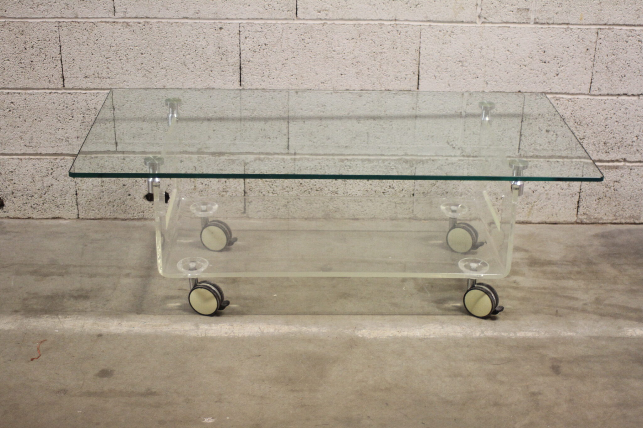 Table basse design en verre et plexiglas.