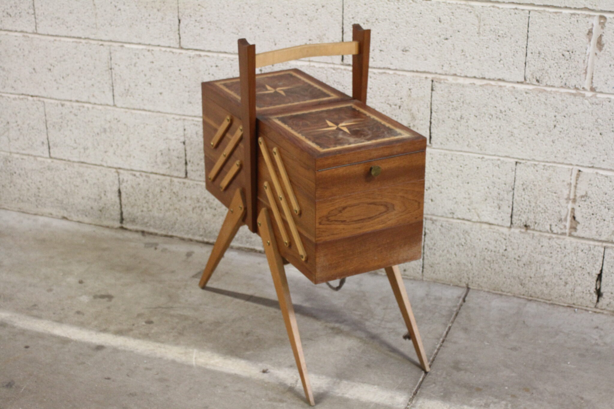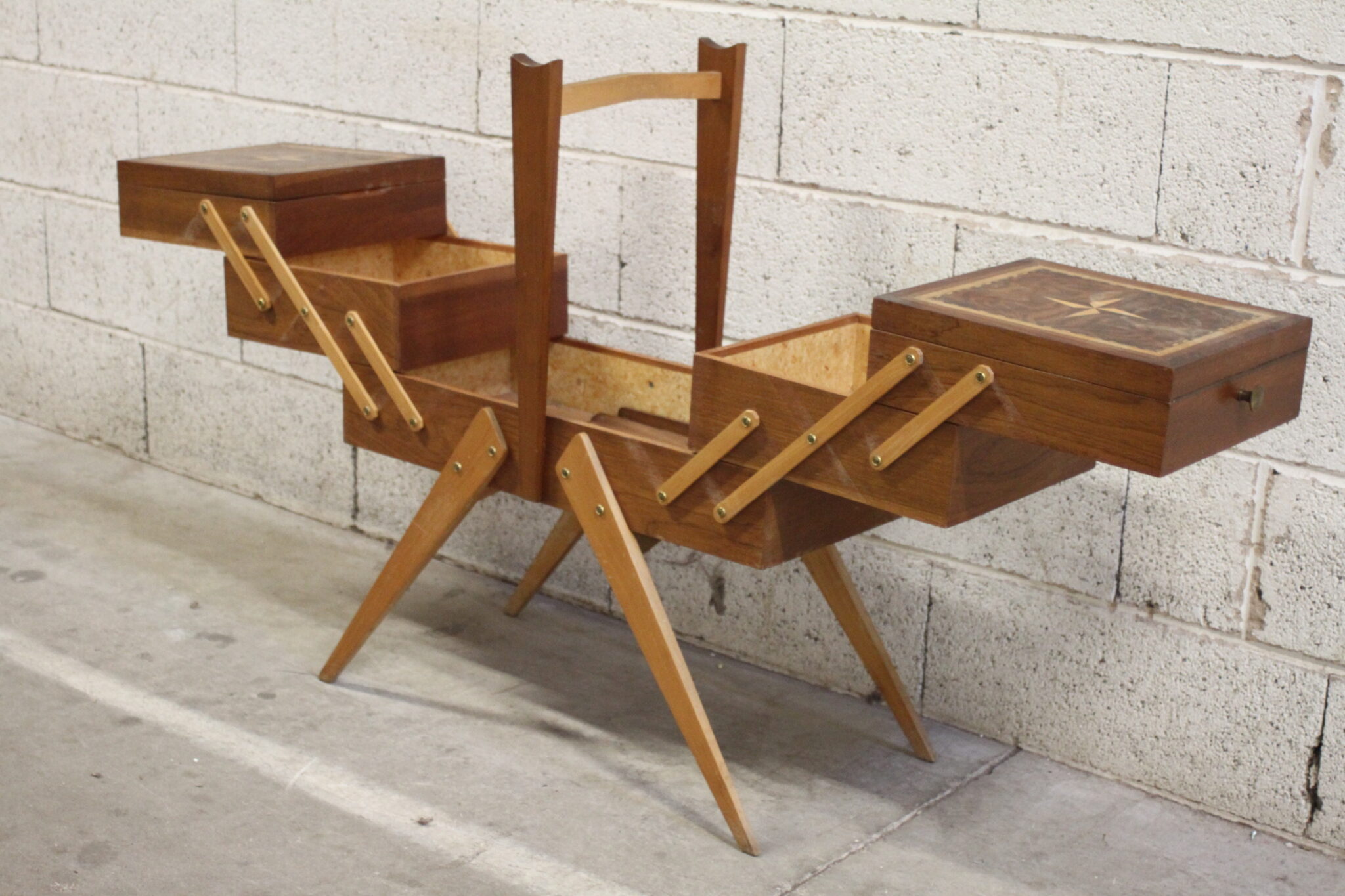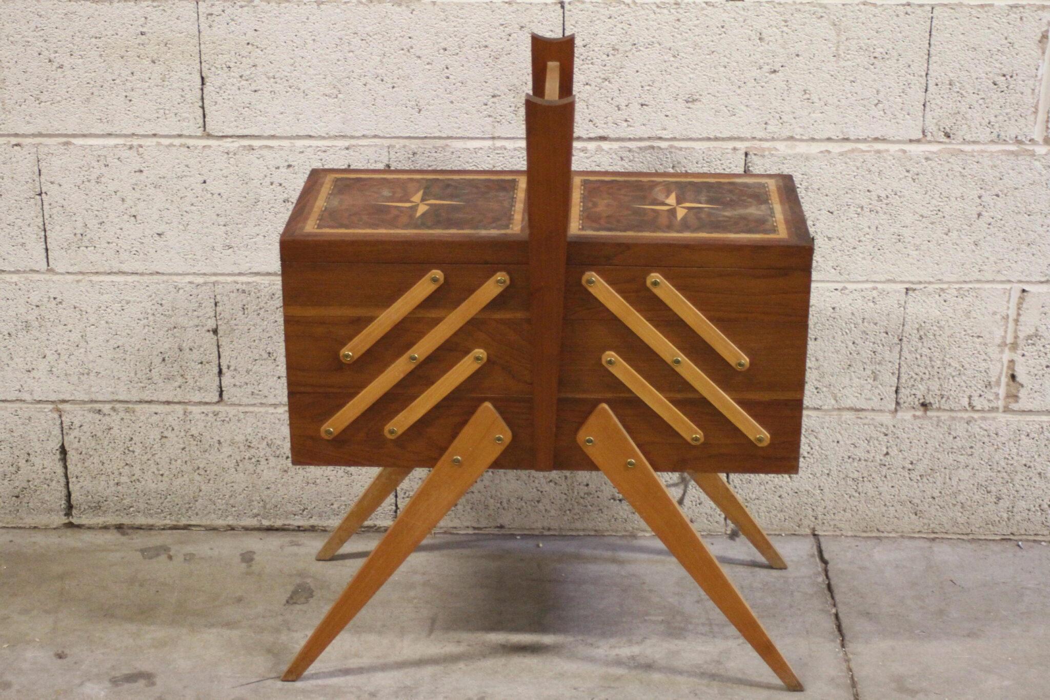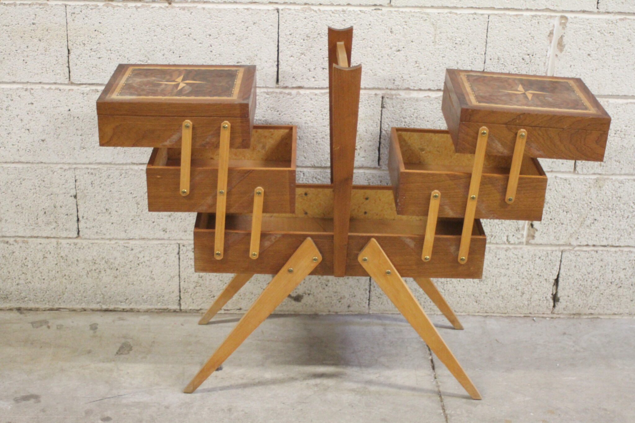 Travailleuse à 5 compartiments avec une belle finition en marqueterie sur le dessus.
