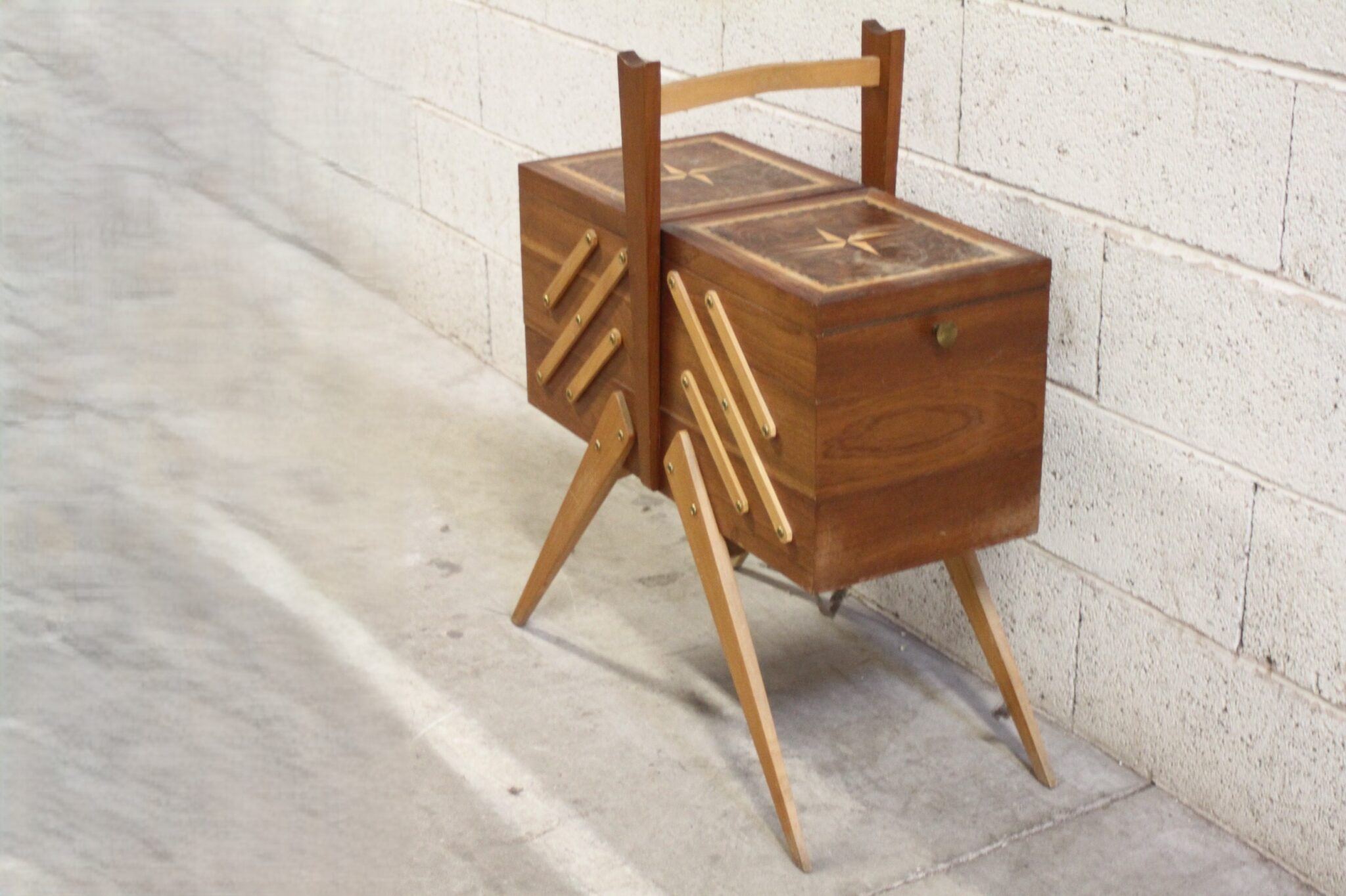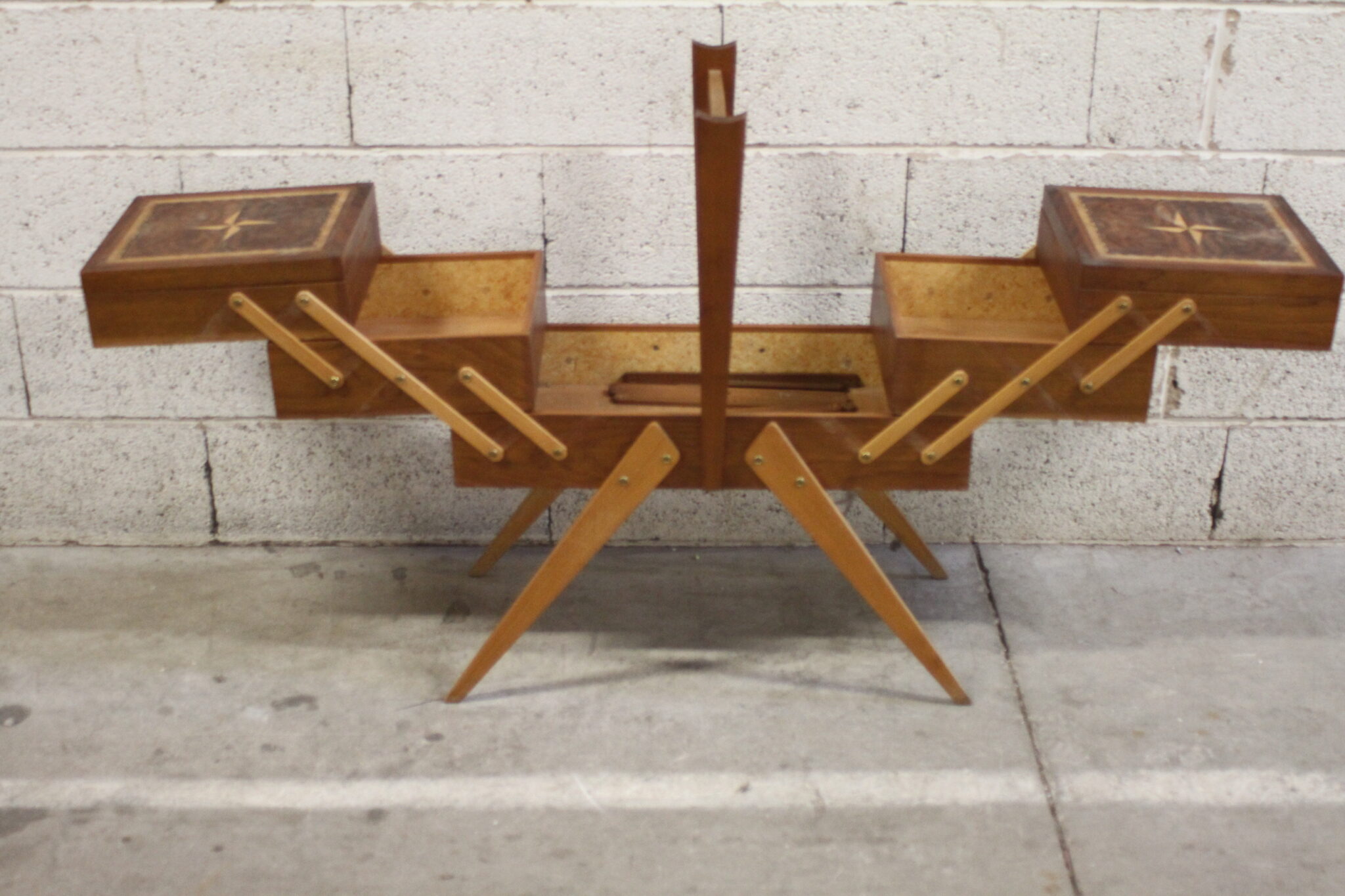 Superbe travailleuse en bois bicolore sur pieds compas.