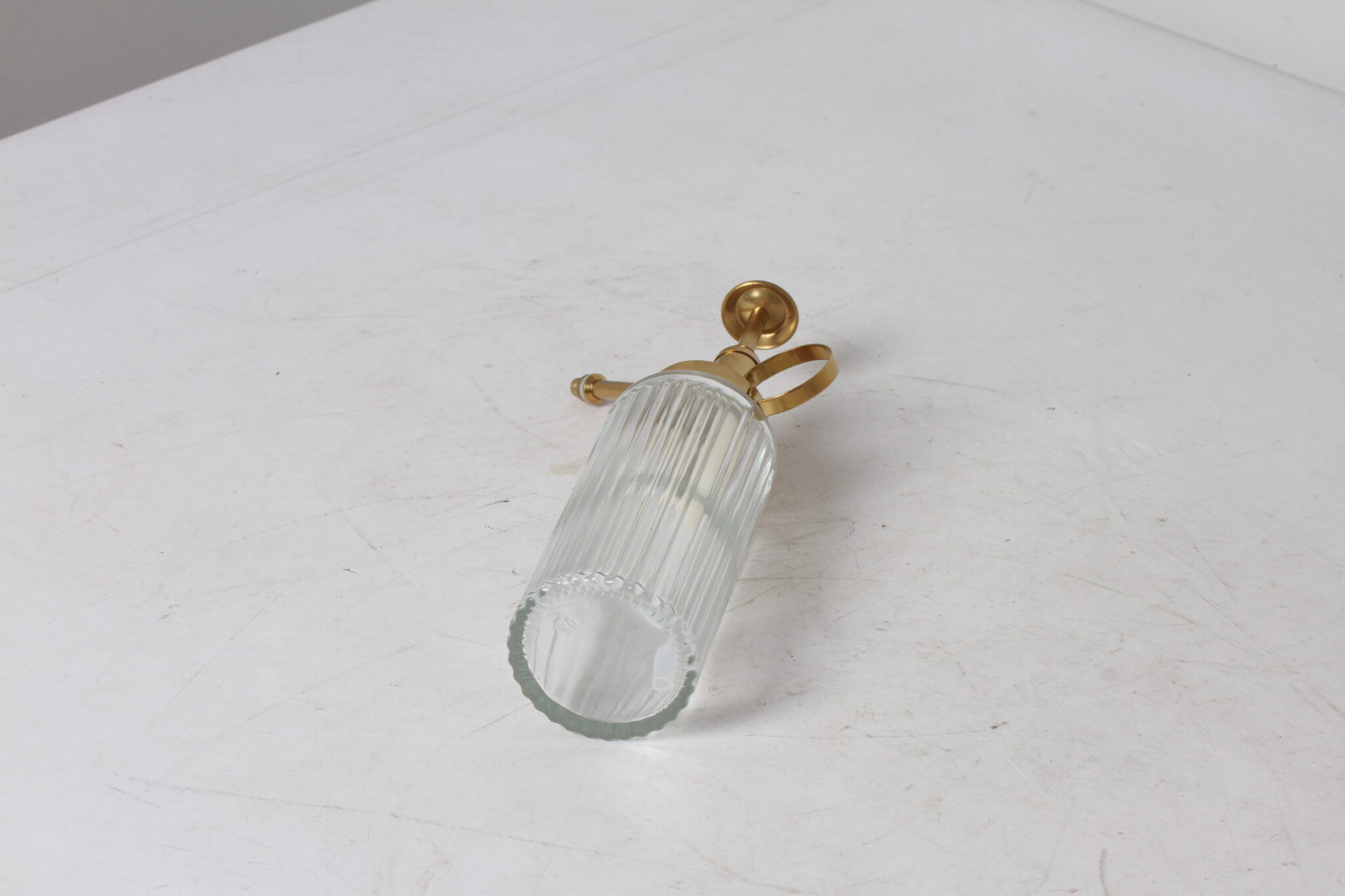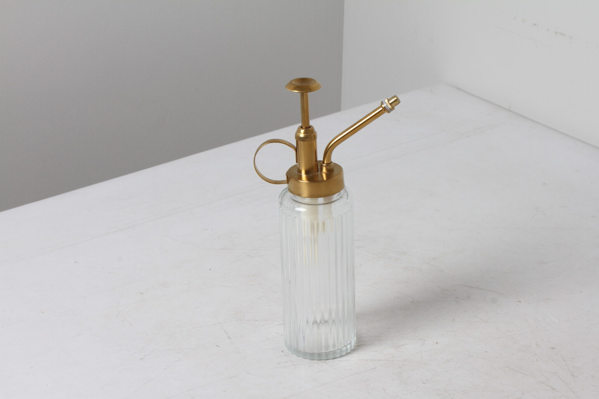 Vaporisateur d’intérieur pour plantes, de style rétro, en métal doré et verre strié.