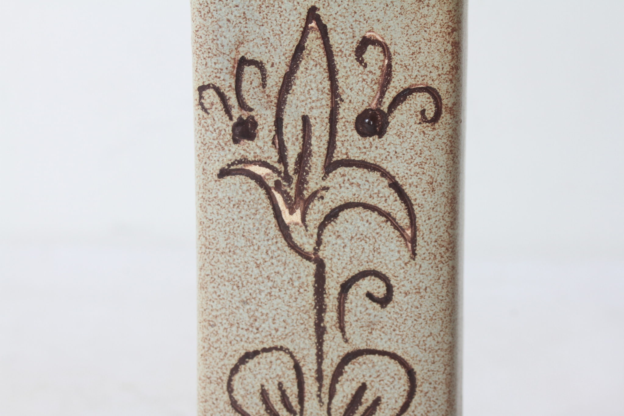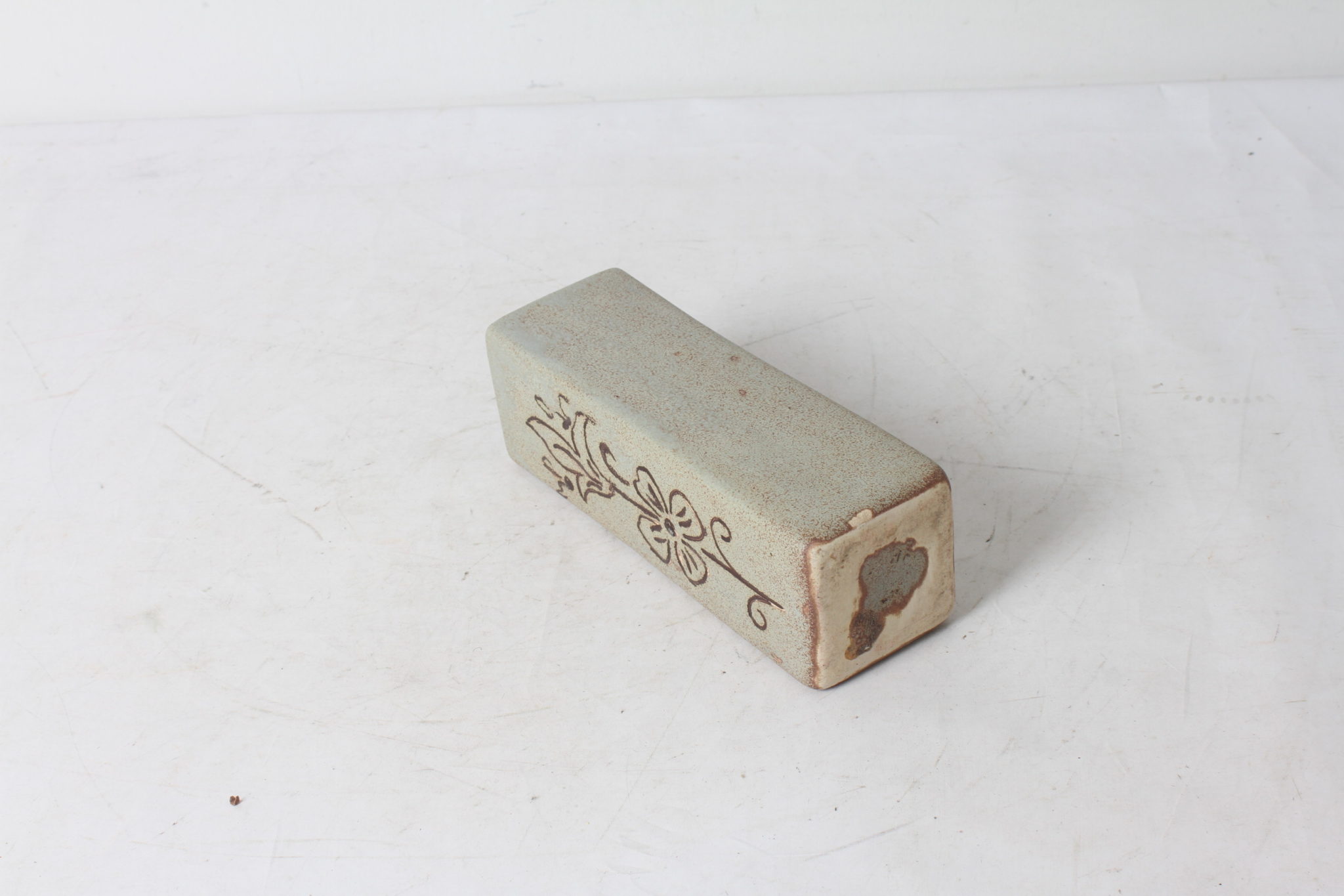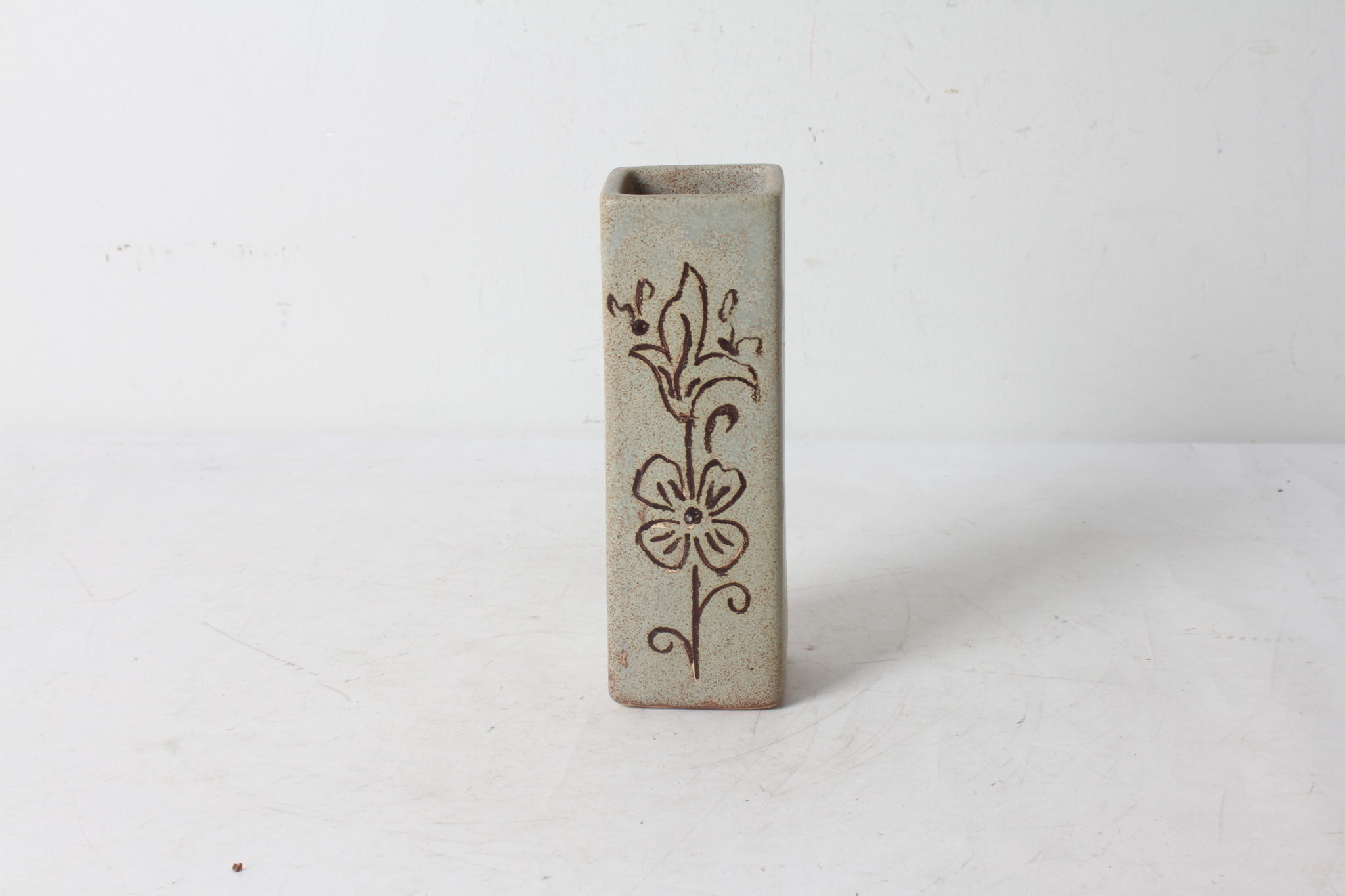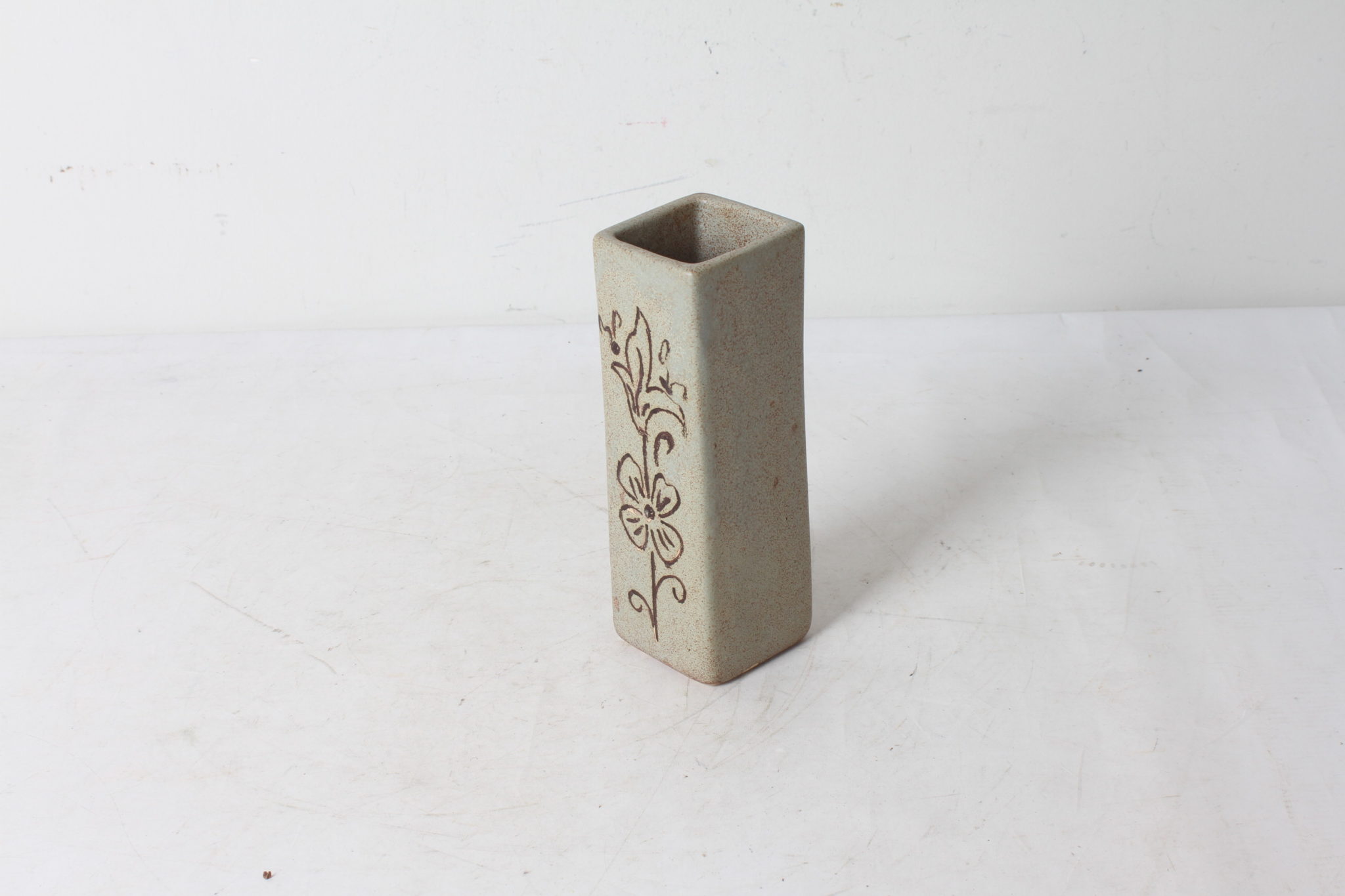 Petit vase carré en céramique à motif floral et aux couleurs naturelles.