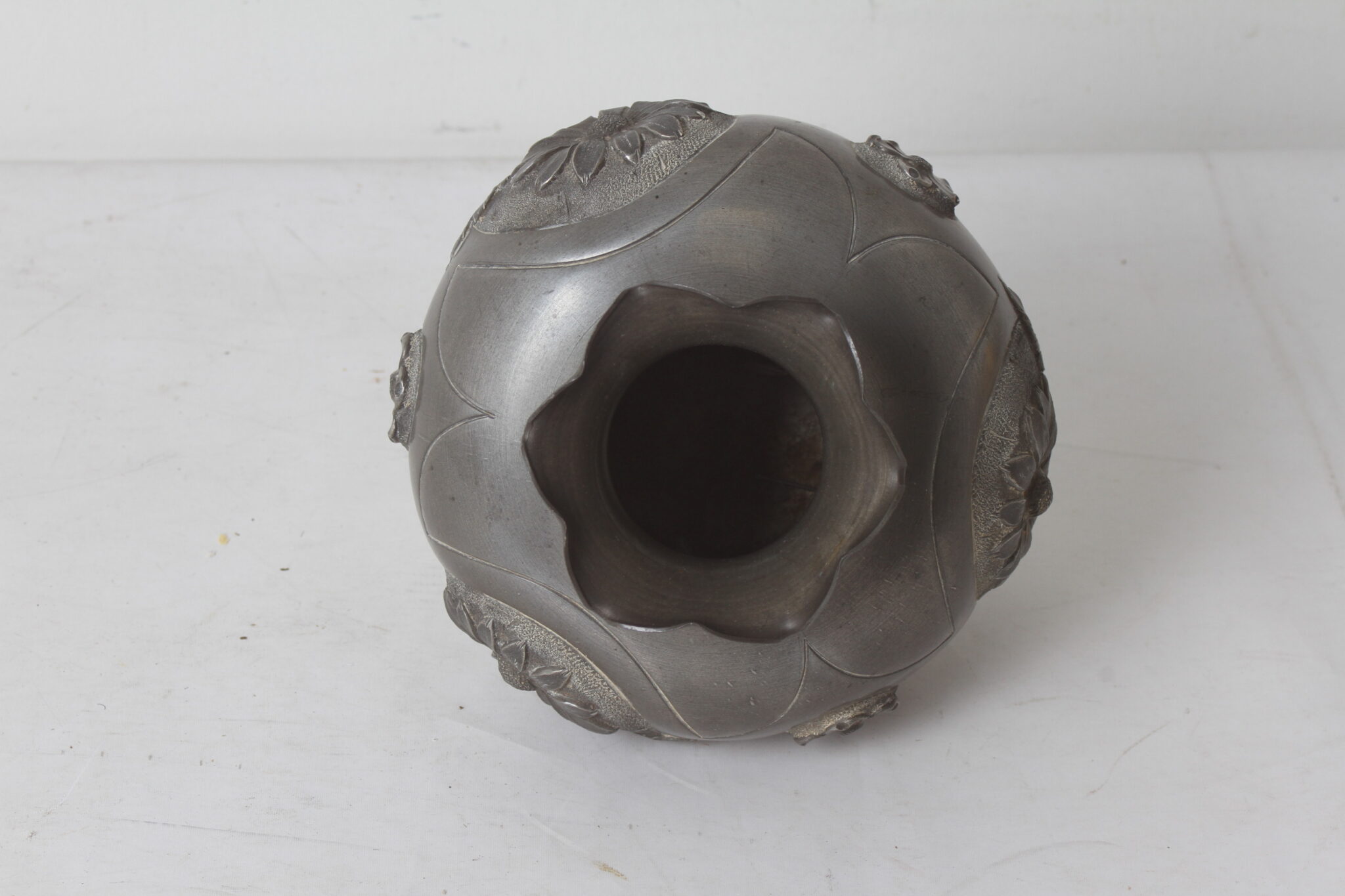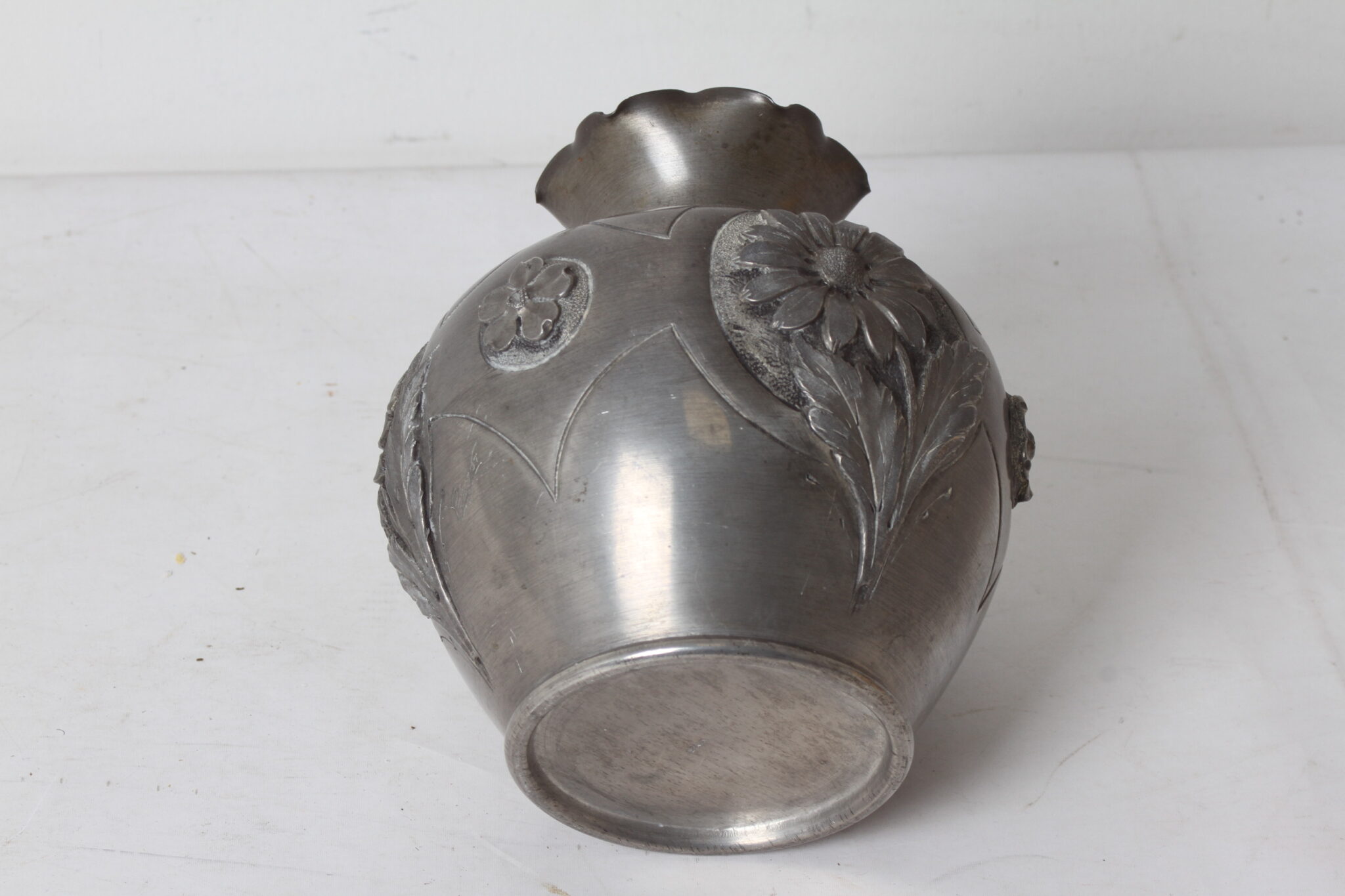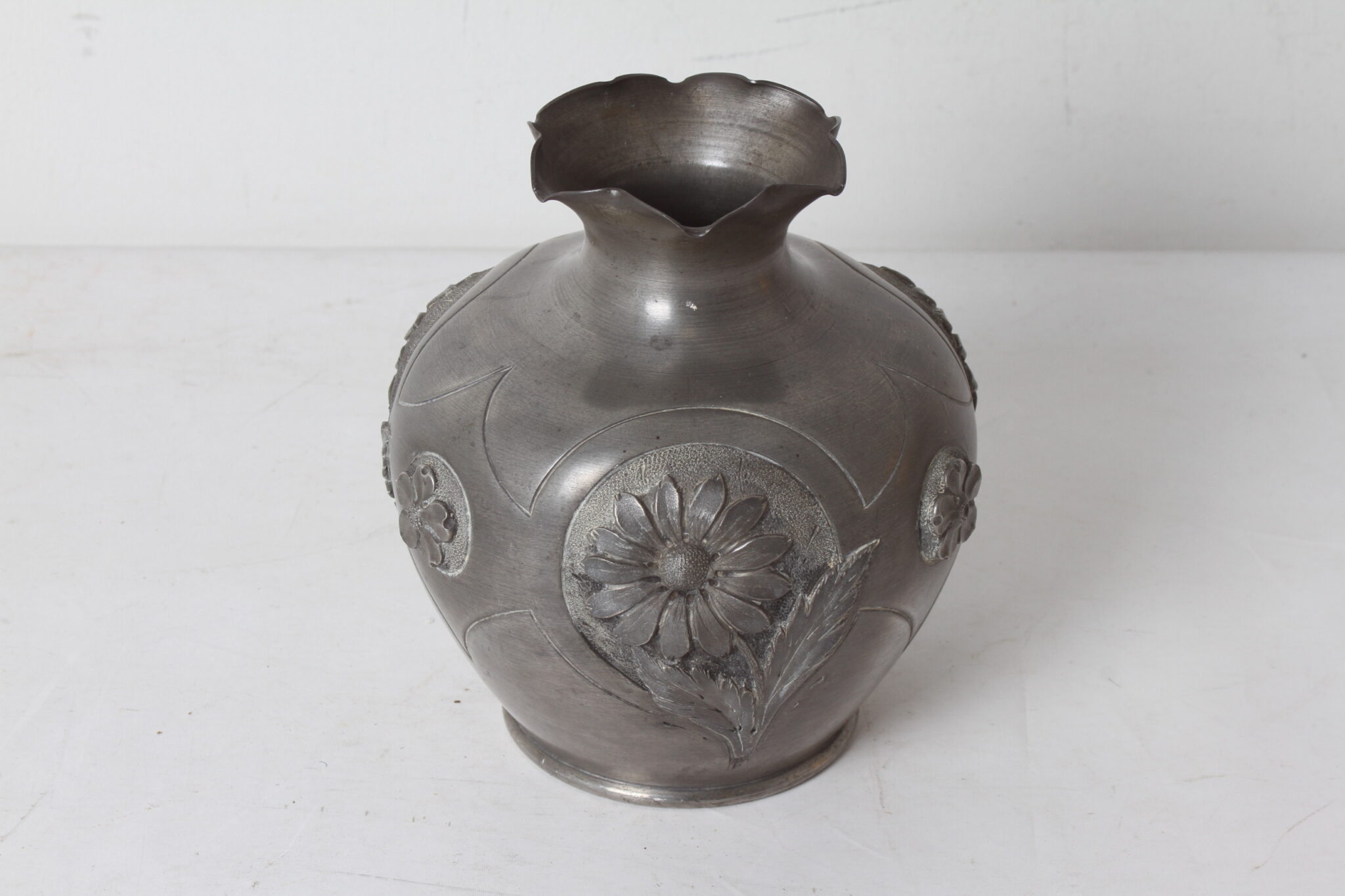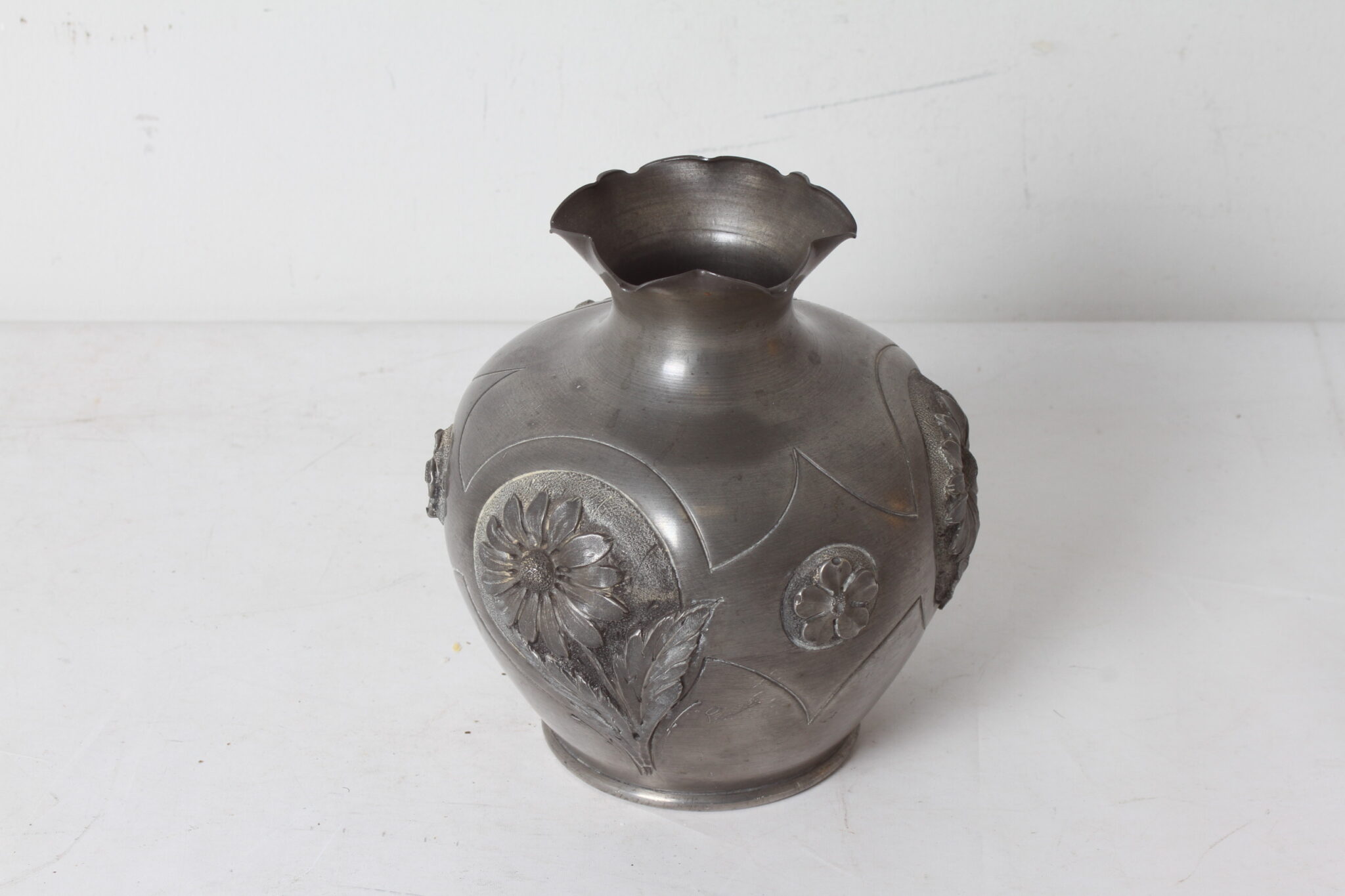 Ancien vase en étain à décor repoussé, signé Prévot.