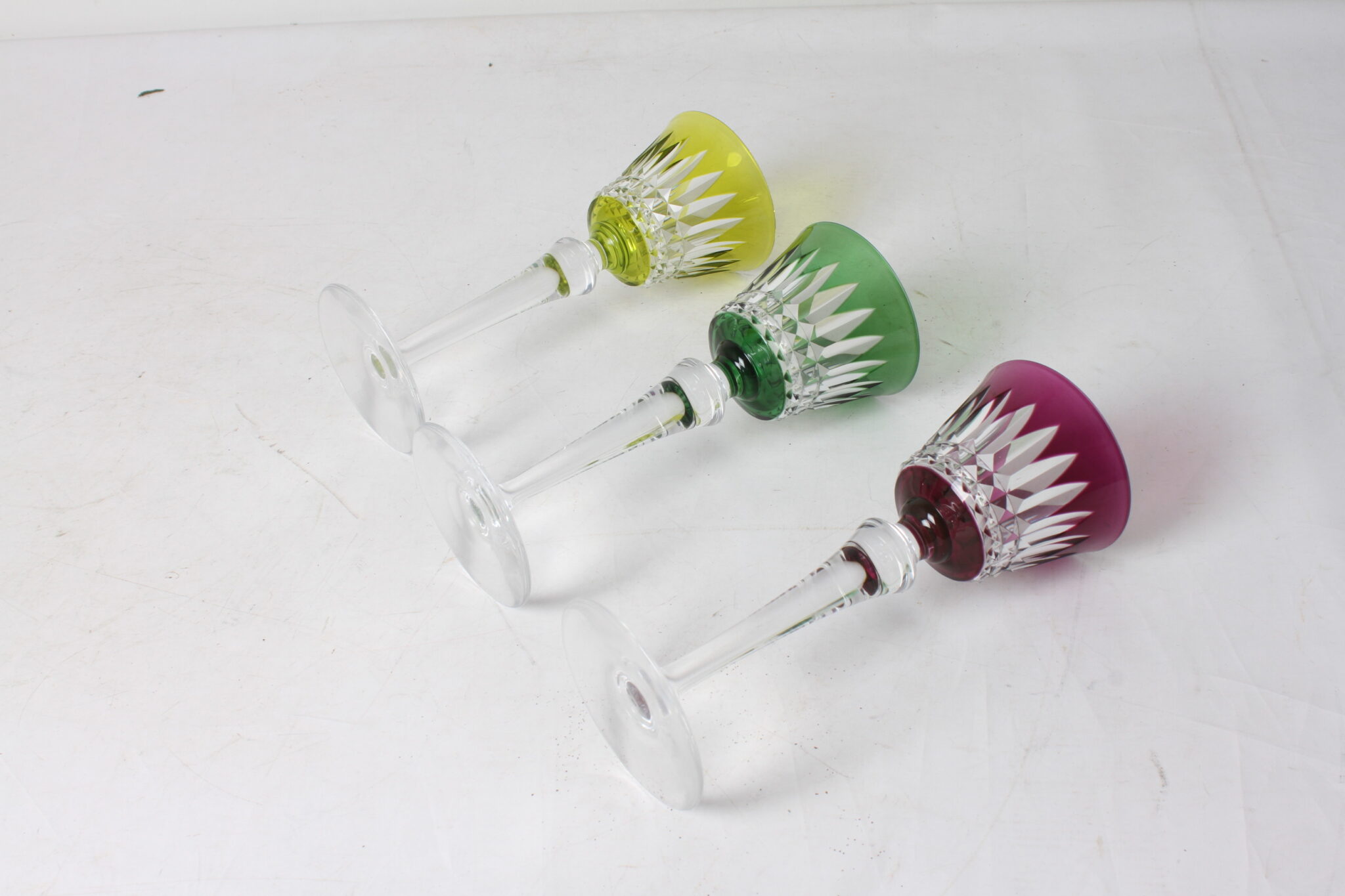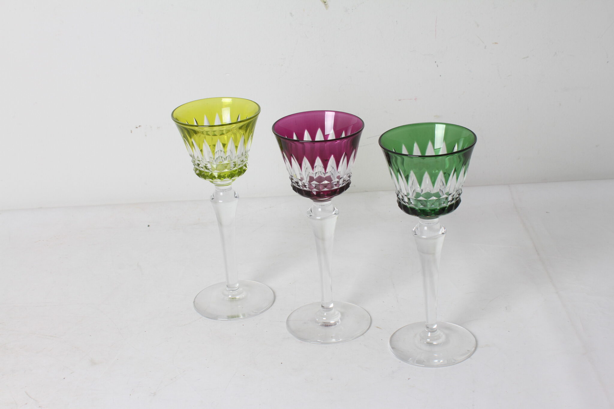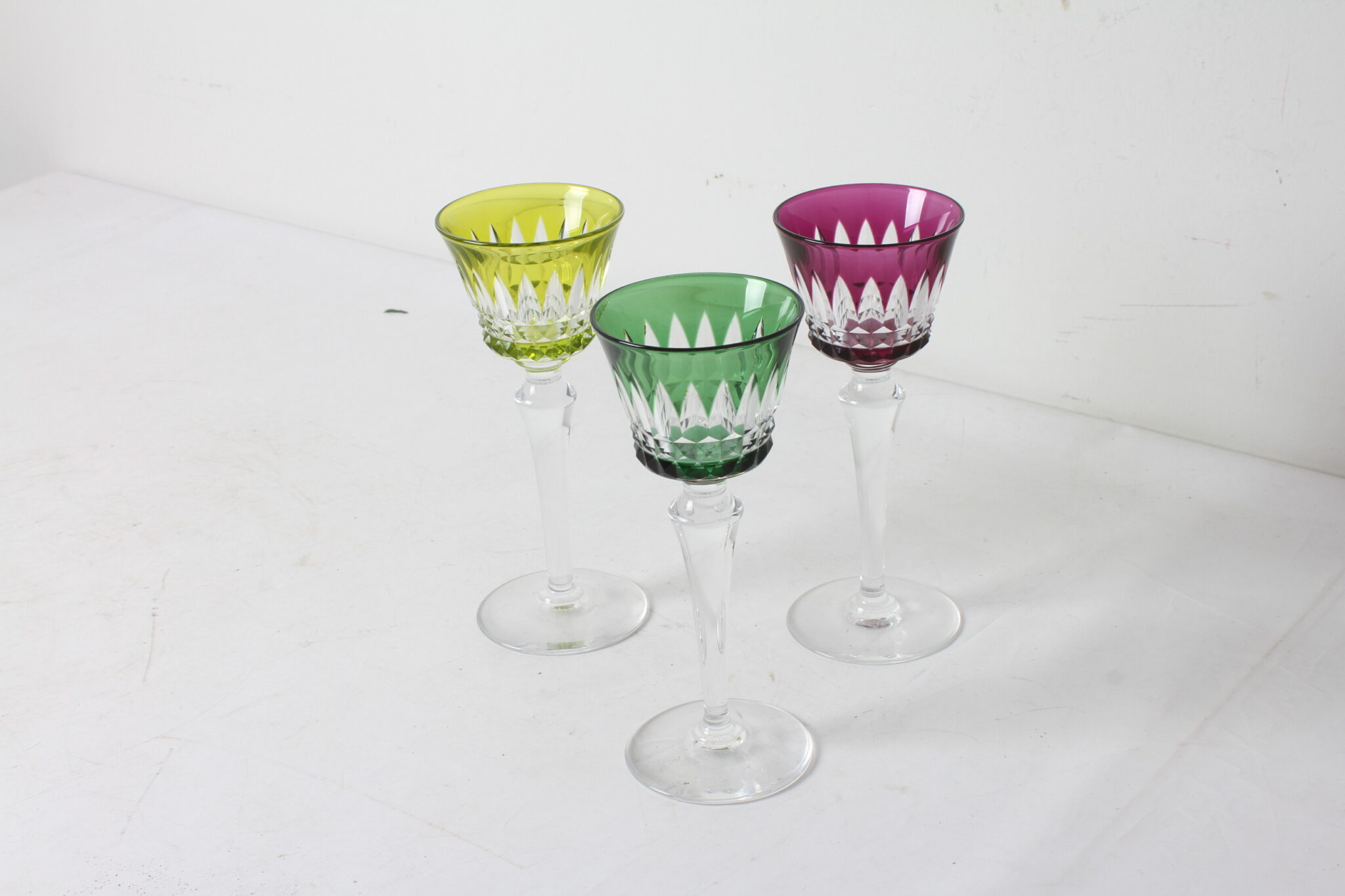 Verres en cristal taillé sur haut pied, 1 vert, 1 jaune et 1 violet.