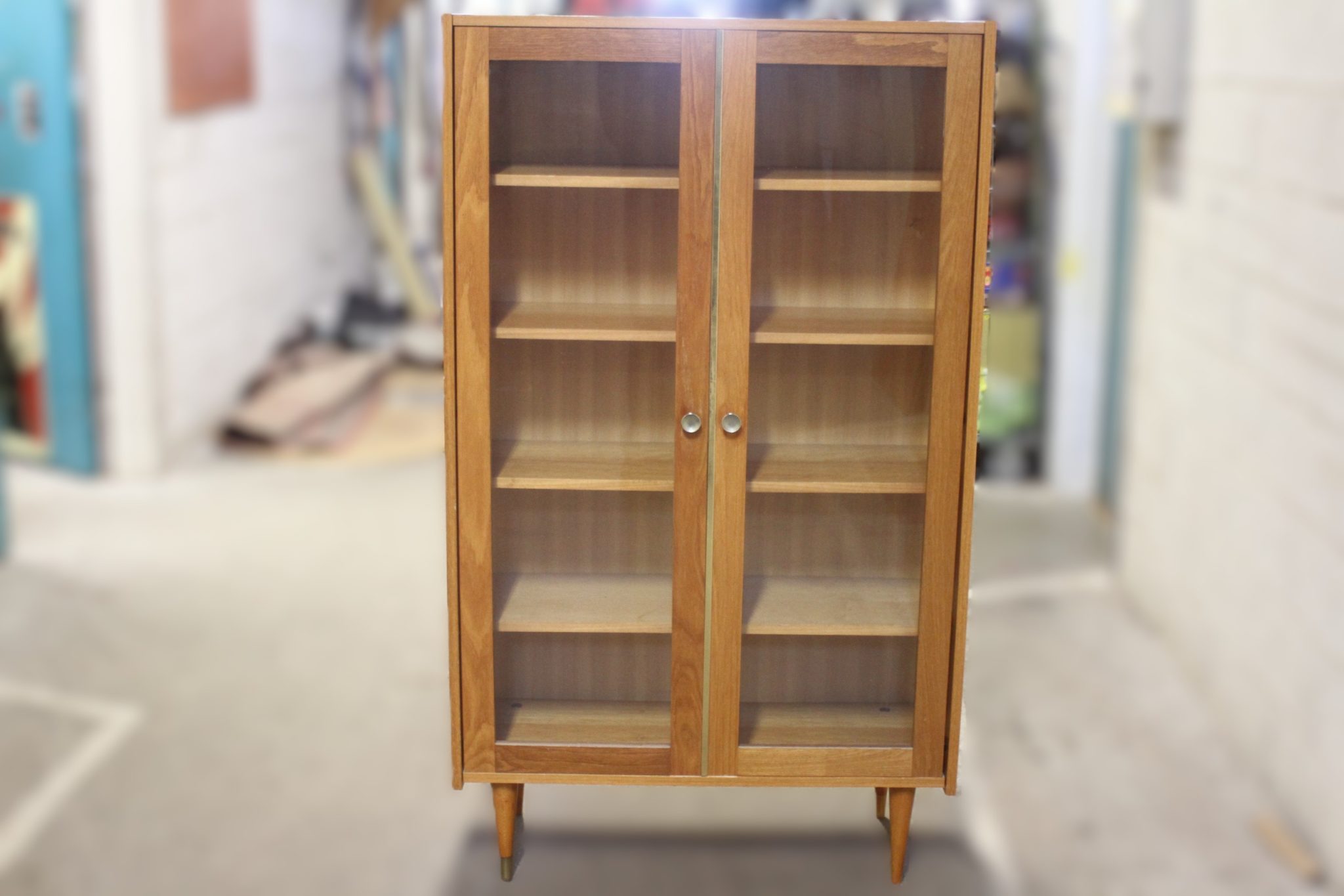 Bibliothèque sur pieds à 5 niveaux, avec poignées boutons et finitions en métal doré.